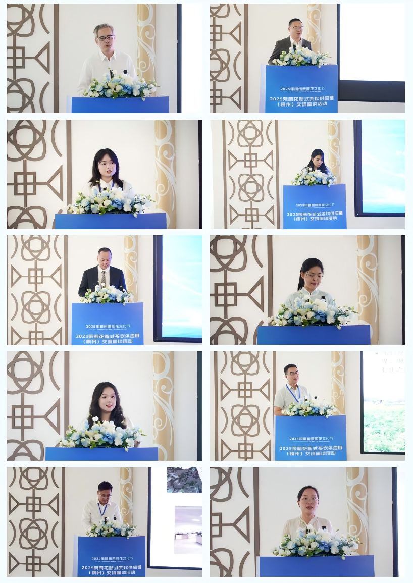 横州市人民政府副市长蒙柯宇向与会代表推介横州茉莉花产业,中茶福建、川茶集团、奈雪的茶、佩索贸易分别就花茶出口、新茶饮品牌建设、花茶海外市场发展现状等方面进行分享交流。横州市花茶协会及隆盛源、顺来茶业、祥园茗品、莉香茶业、香茹怡茉等本地企业代表进行推介发言。