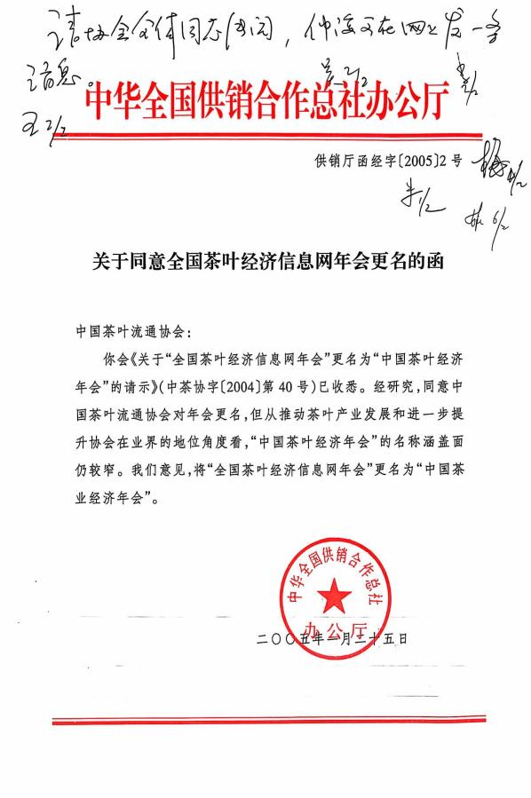 2004年,在四川峨眉山举行的第20届“全国茶叶经济信息网年会”上,经中国茶叶流通协会三届四次理事会议讨论通过,报中华全国供销合作总社批准,决定自2005起将会议正式更名为“中国茶业经济年会”,并按照通过的年会申办管理制度,对中国茶业经济年会承办地改为申办制,茶行业的年度盛会开启了新纪元。