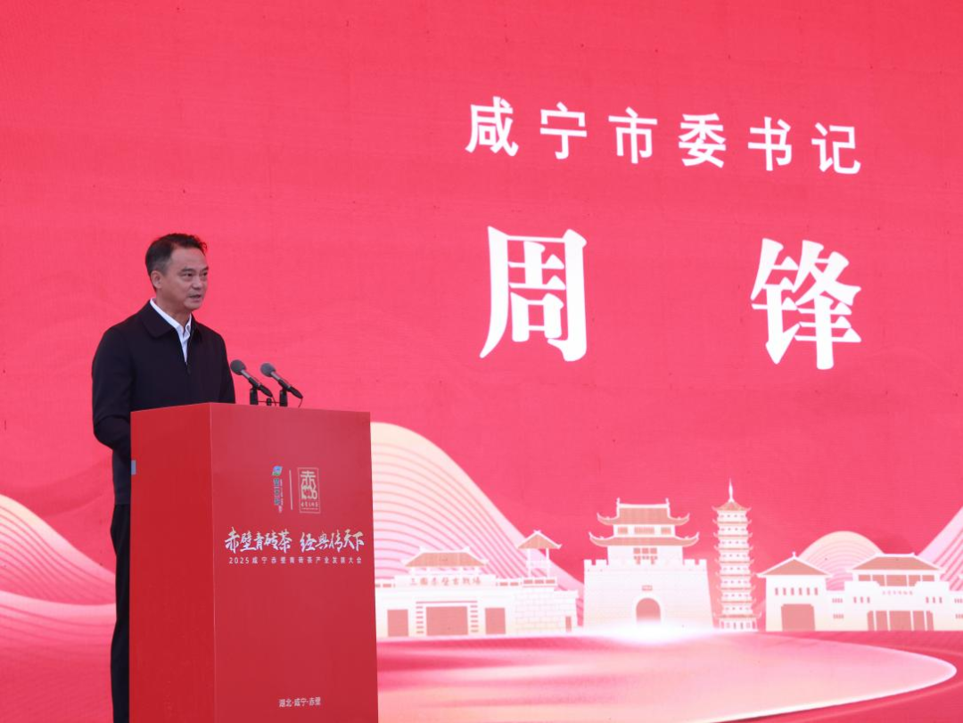 周锋书记代表咸宁市委、咸宁市人民政府和全市人民向莅临大会的领导、嘉宾表示诚挚欢迎和衷心感谢,并详细介绍了咸宁茶产业发展成就。他表示,近年来,咸宁围绕打造百亿茶产业,将茶叶纳入“三重七特”农业产业体系,实行“链长制”,壮大茶经济,建成优质茶叶基地53.47万亩,年产赤壁青砖茶8万吨,开发茶饮料、茶食品、茶医药、茶日化等100多类300多种衍生产品,综合产值达226亿元,“赤壁青砖茶”品牌价值超50亿元,带动就业5万余人,千年茶饮、万里茶道在新时代焕发出蓬勃生机。