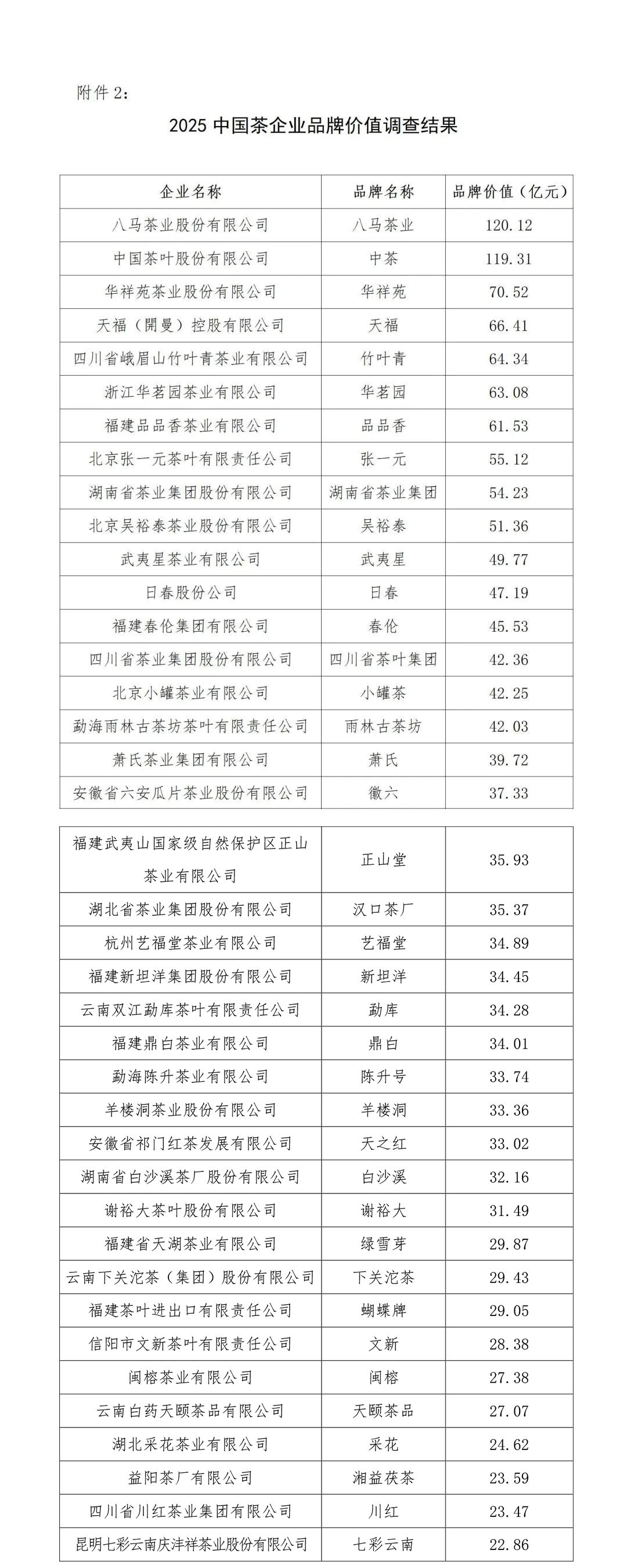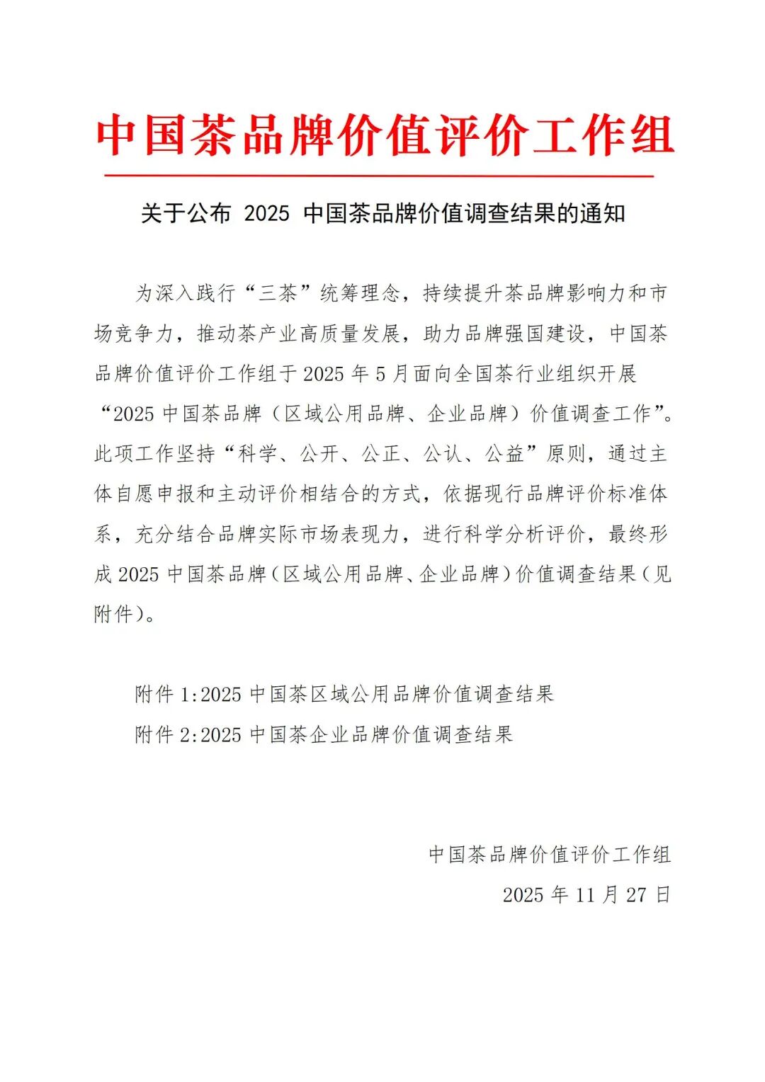11月27日,由新华社品牌工作办公室、中国经济信息社、中国茶叶流通协会主办的2025中国茶品牌建设论坛在浙江新昌成功举办。论坛上正式发布了“2025中国茶品牌(区域公用品牌、企业品牌)TOP50”系列调查成果。