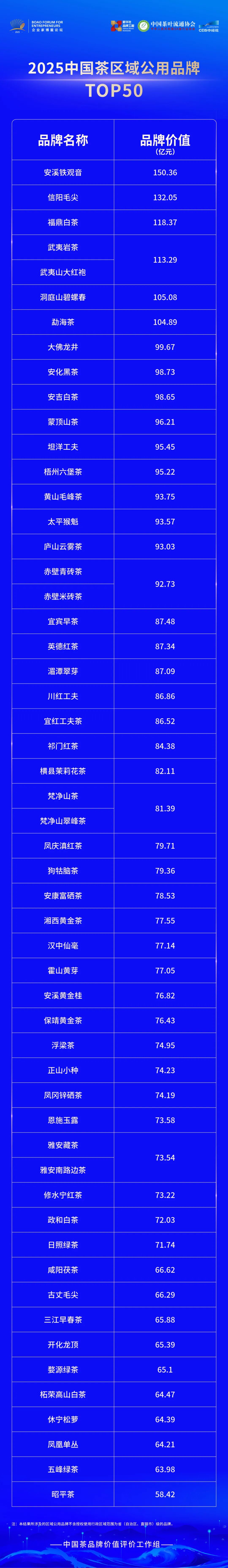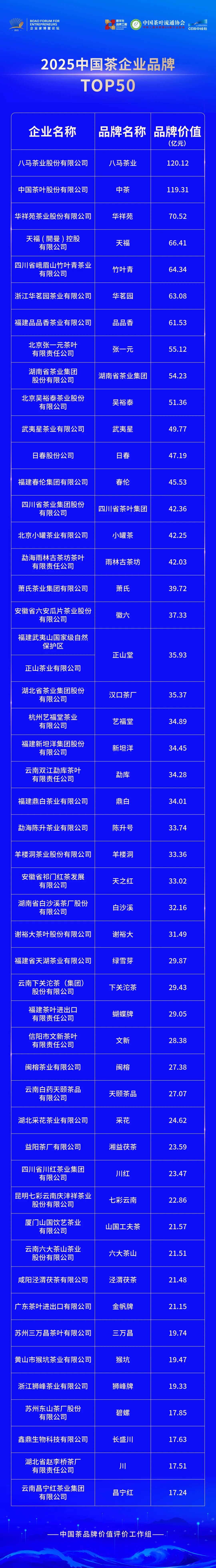 “2025中国茶品牌(区域公用品牌、企业品牌)TOP50”系列调查由中国经济信息社、中国茶叶流通协会共同发起,由双方组建的“中国茶品牌价值评价工作组”组织执行。该系列调查旨在落实“三茶”统筹理念,推动茶产业高质量发展,助力品牌强国建设。