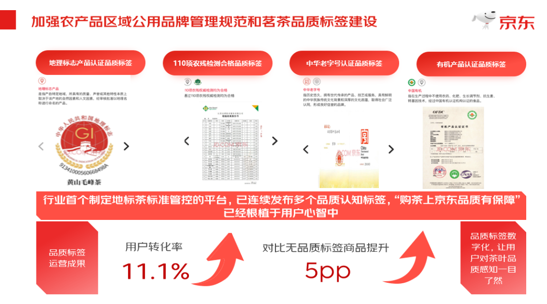 此前,京东超市为了让用户增强线上购买茶叶的信心,率先推出茗茶品质标签体系,包括地标认证品质标签、110项农残检测合格品质认证标签、中华老字号品质标签认证和有机茶品质标签认证,还从原料、产地、品控、等级、效期、售后六个维度推出了采销六大甄选标准,带动商品转化率提升5个百分点。