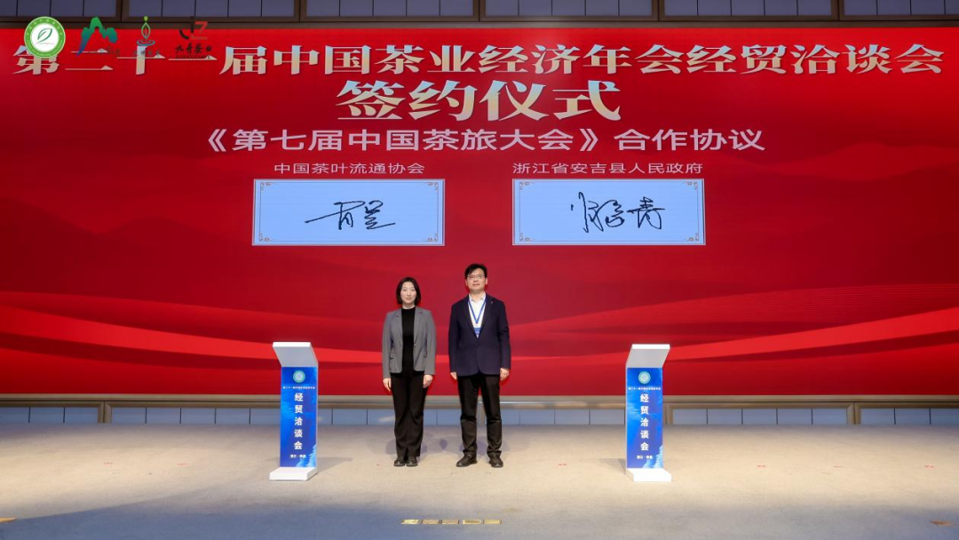 中国茶叶流通协会秘书长肖星与安吉县人民政府签订《第七届中国茶旅大会》合作协议。