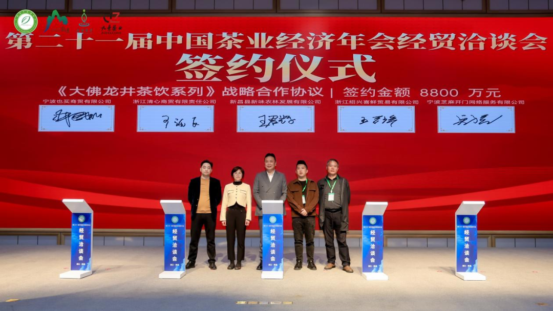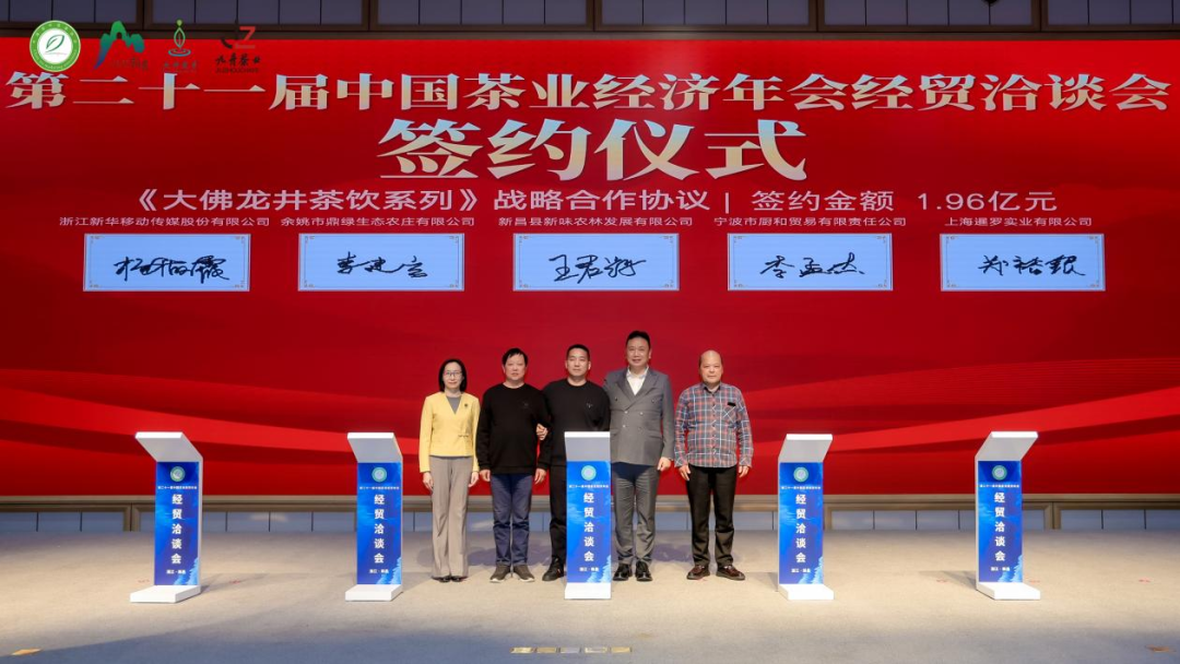 新昌县新味农林发展有限公司与浙江新华移动传媒股份有限公司、余姚市鼎绿生态农庄有限公司、宁波市厨和贸易有限责任公司、上海暹罗实业有限公司签订《大佛龙井茶饮系列》战略合作协议。