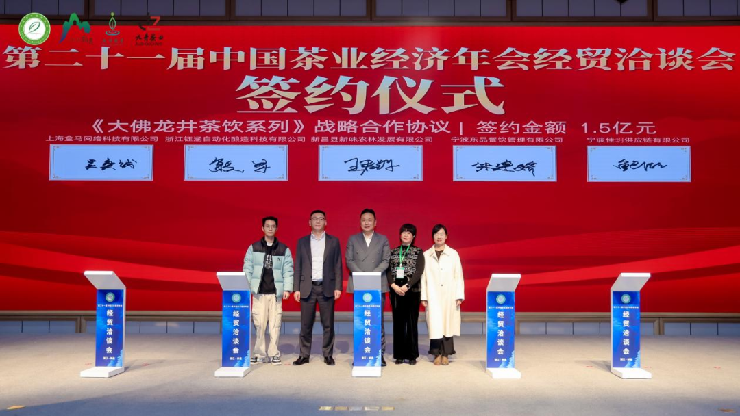 新昌县新味农林发展有限公司与上海盒马网络科技有限公司、浙江钰涵自动化酿造科技有限公司、宁波东品餐饮管理有限公司、宁波佳玥供应链有限公司签订《大佛龙井茶饮系列》战略合作协议。