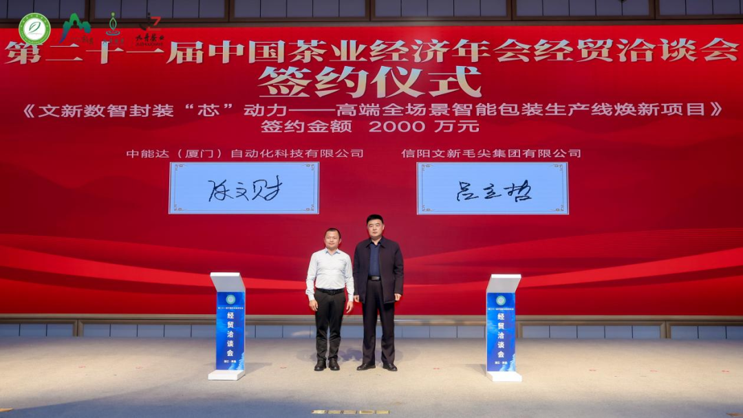 中能达(厦门)自动化科技有限公司与信阳文新毛尖集团有限公司签订《文新数智封装“芯”动力 —— 高端全场景智能包装生产线焕新项目》合作协议。
