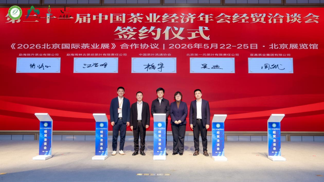 中国茶叶流通协会副会长梅宇分别与北京张一元茶叶有限责任公司、勐海雨林古茶坊茶叶有限责任公司、勐海陈升茶业有限公司、宜茶集团代表签署《2026北京国际茶业展》合作协议。