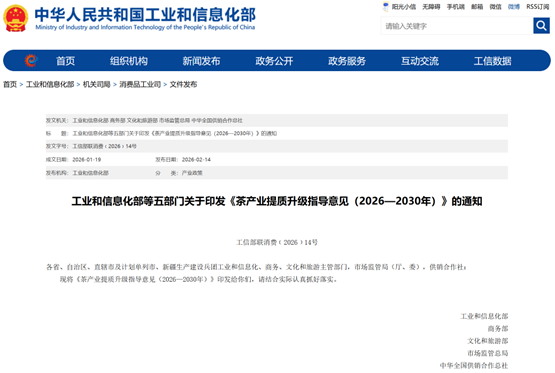 2月14日,工业和信息化部、商务部、文化和旅游部、市场监管总局、中华全国供销合作总社五部门联合印发了《茶产业提质升级指导意见(2026-2030年)》(工信部联消费﹝2026﹞14号)。该文件对“十五五”时期中国茶产业的高质量发展具有重大意义。建议茶行业重点关注。