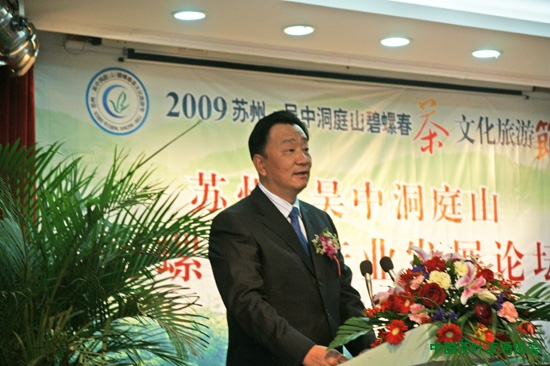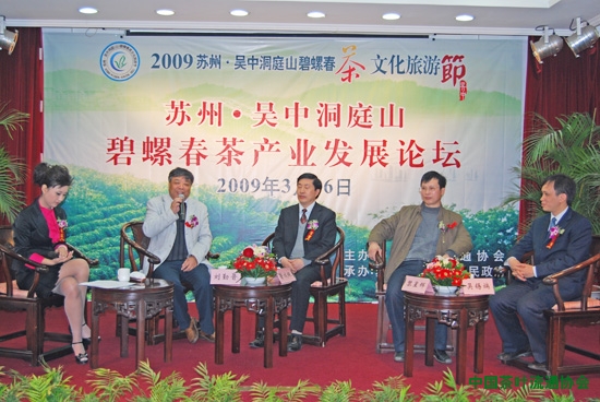 2009年3月16日上午,由中国茶叶流通协会主办,苏州吴中区人民政府承办的苏州·吴中洞庭山碧螺春茶产业发展论坛在太湖东山成功举办。中国茶叶流通协会常务副会长王庆和协会副会长李三原、詹立锬、黄汉庆、穆有为、张定、罗乃炘、唐先洪、何一心、阚贵元、周重旺、刘永,以及苏州吴中区副区长张炳华出席产业论坛。中国农科院茶叶研究所副所长鲁成银、西南农业大学教授刘勤晋、南京农业大学教授黎星辉、中国茶叶流通协会秘书长吴锡端等四位专家从种植、生产、营销等诸多方面展开精彩的对话,把脉吴中洞庭山碧螺春茶产业。论坛吸引了中国茶叶流通协会邀请的业内百余名专业采购商和当地茶叶企业。