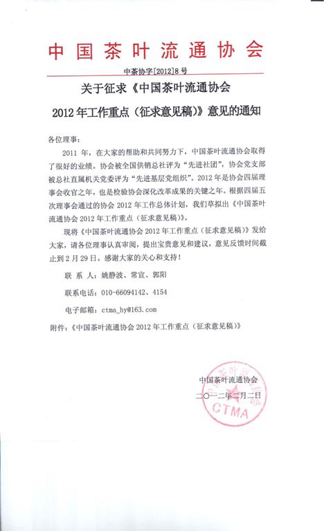 印发《中国茶叶流通协会2012年工作重点》的通知