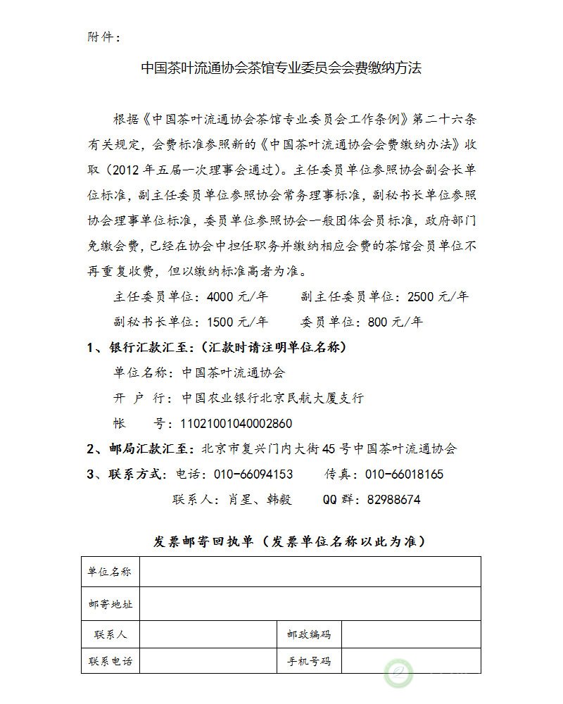 附件:中国茶叶流通协会茶馆专业委员会会费缴纳方法