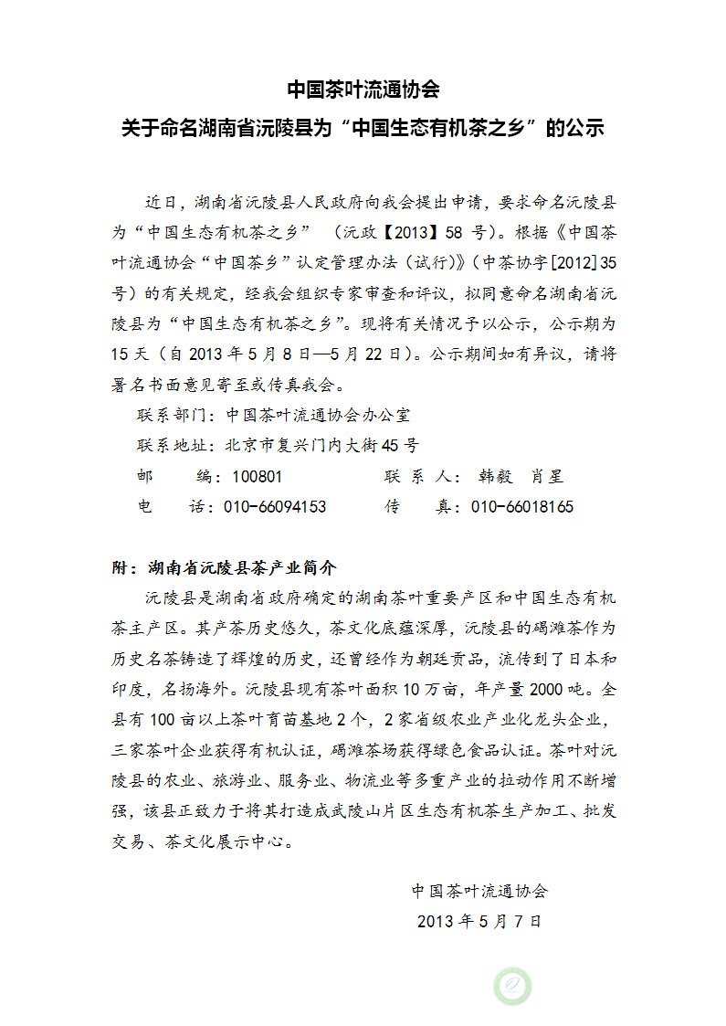 关于命名沅陵县为“中国生态有机茶之乡”的公示