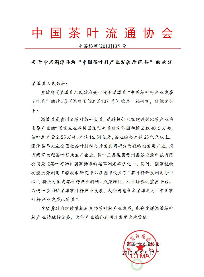 关于命名湄潭县为“中国茶叶籽产业发展示范县”的决定
