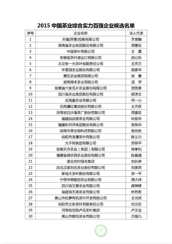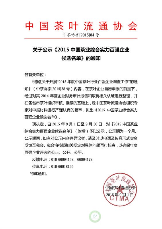 关于公示《2015中国茶业综合实力百强企业候选名单》的通知