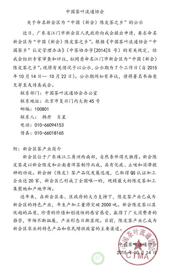 关于命名新会区为“中国(新会)陈皮茶之乡”的公示