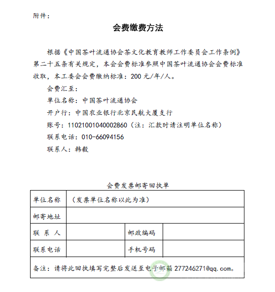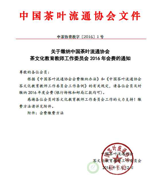 关于缴纳中国茶叶流通协会茶文化教育教师工作委员会2016年会费的通知