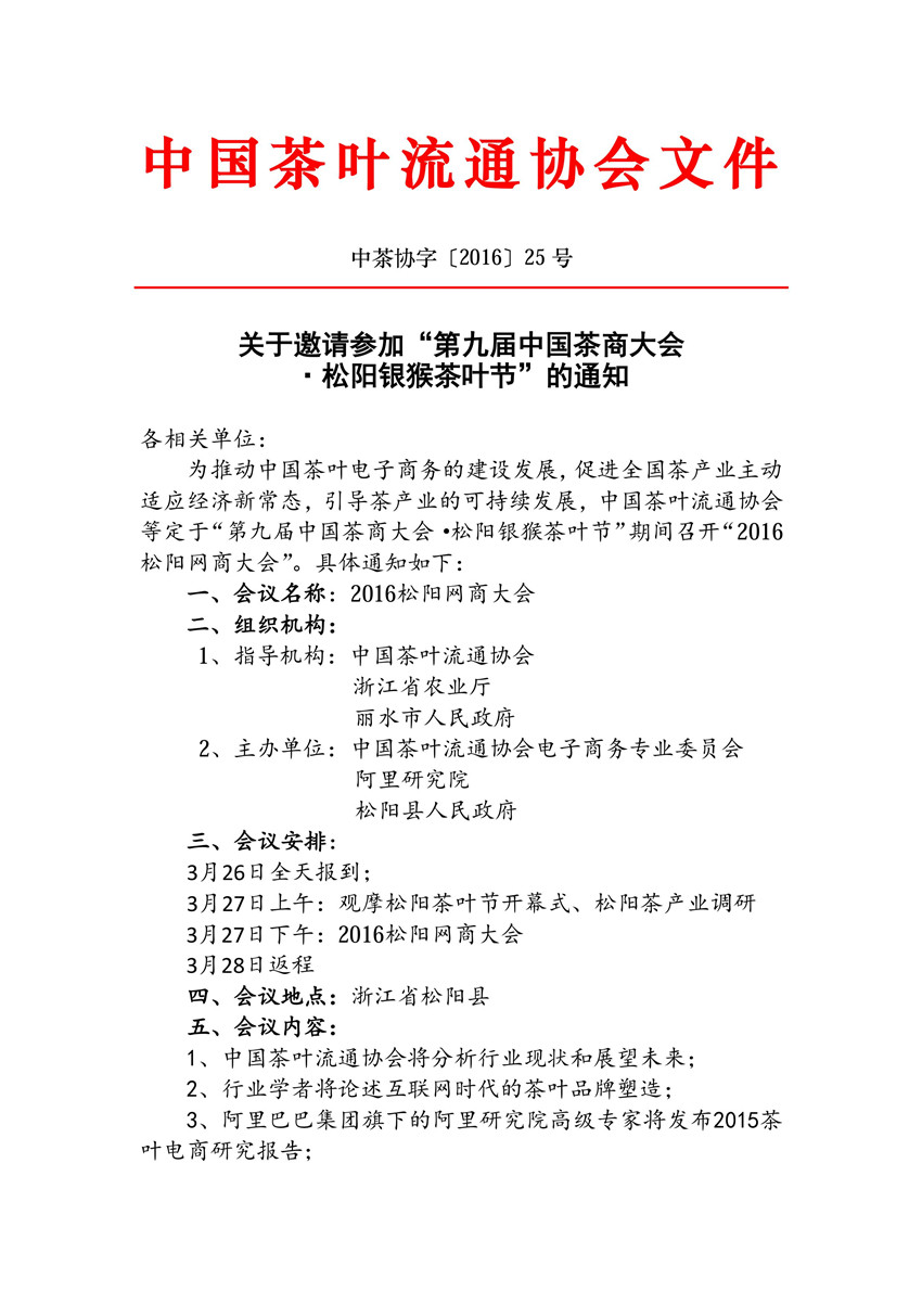 关于邀请参加“第九届中国茶商大会·松阳银猴茶叶节”的通知