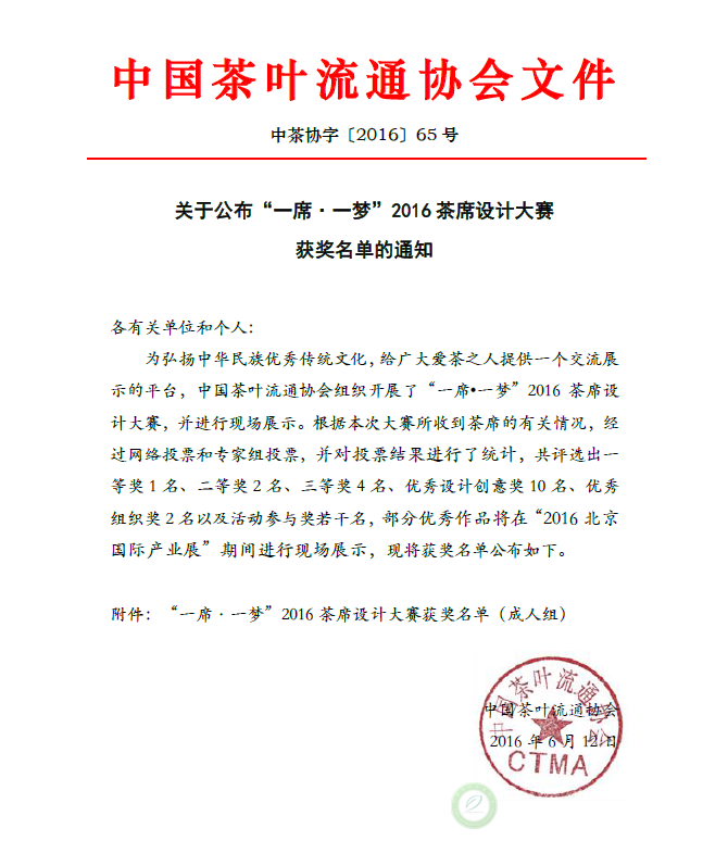 关于公布“一席·一梦”2016 茶席设计大赛获奖名单的通知