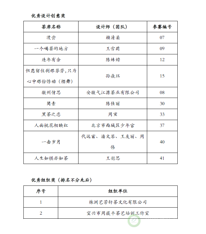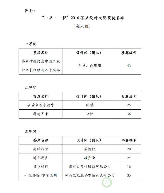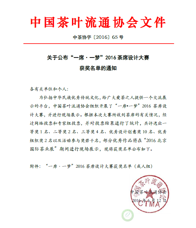 关于公布“一席·一梦”2016 茶席设计大赛获奖名单的通知
