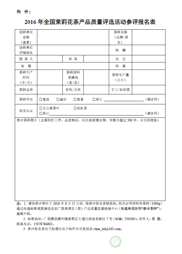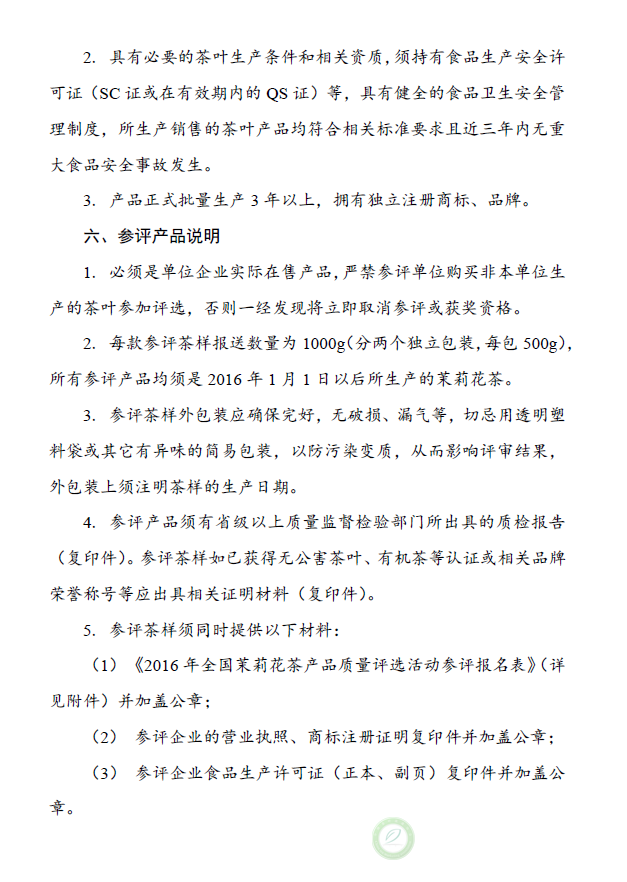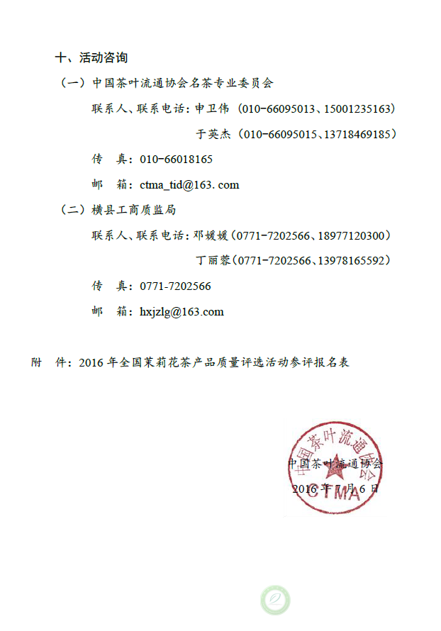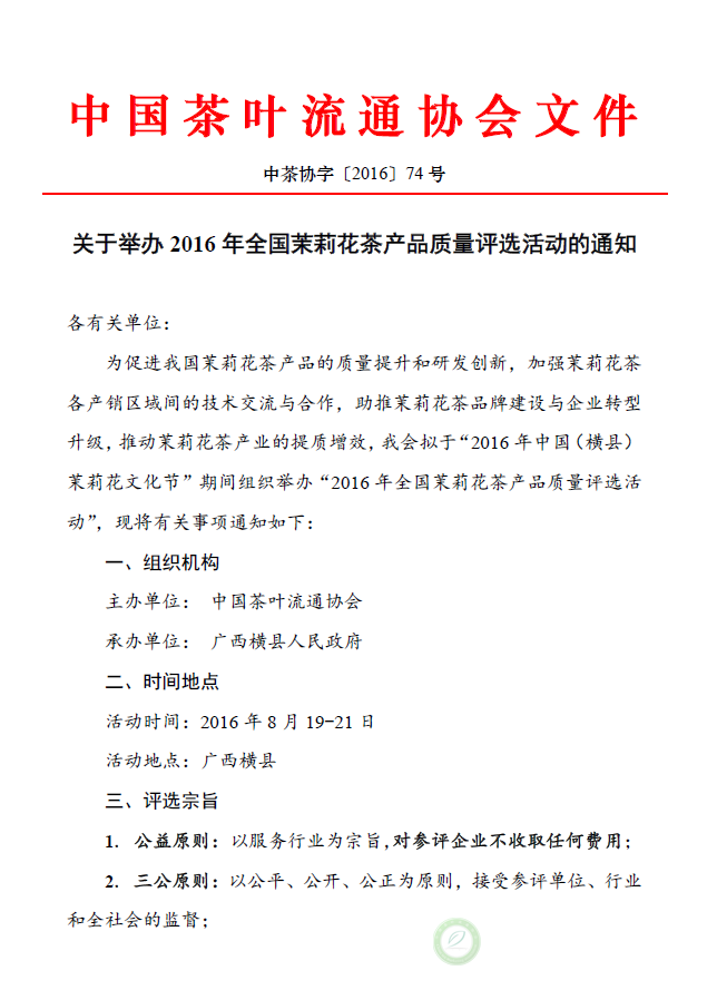 关于举办2016年全国茉莉花茶产品质量评选活动的通知