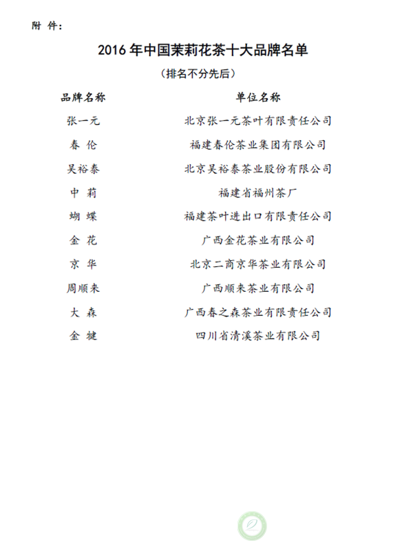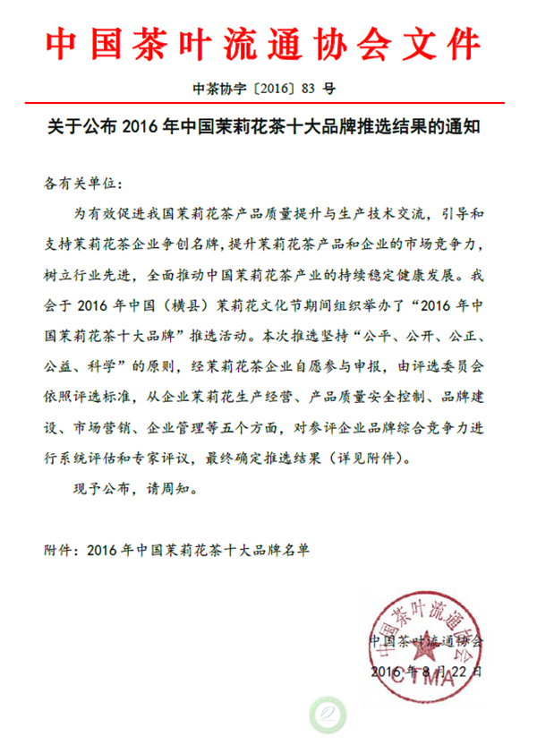 关于公布2016年中国茉莉花茶十大品牌推选结果的通知