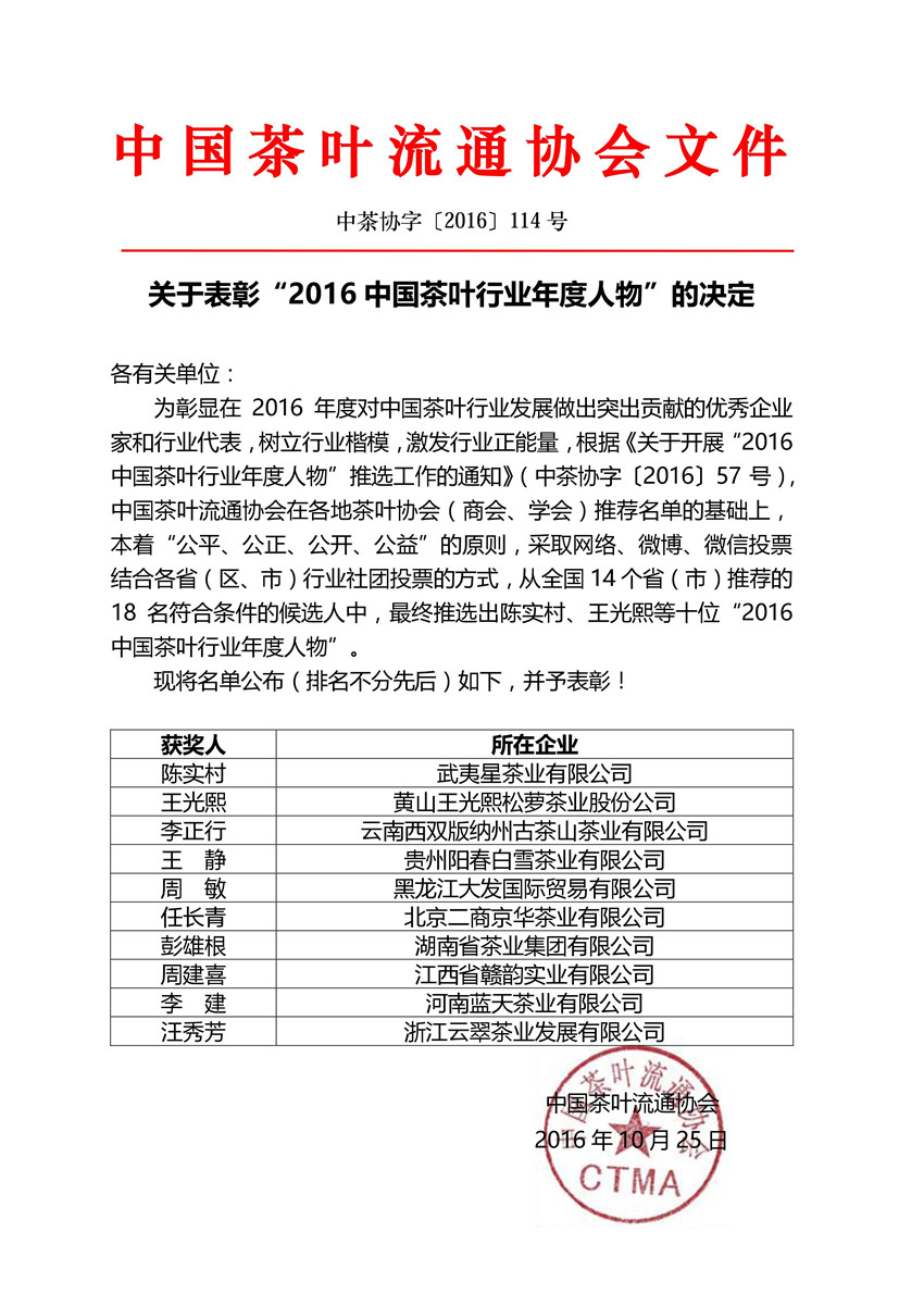 关于表彰“2016中国茶叶行业年度人物”的决定