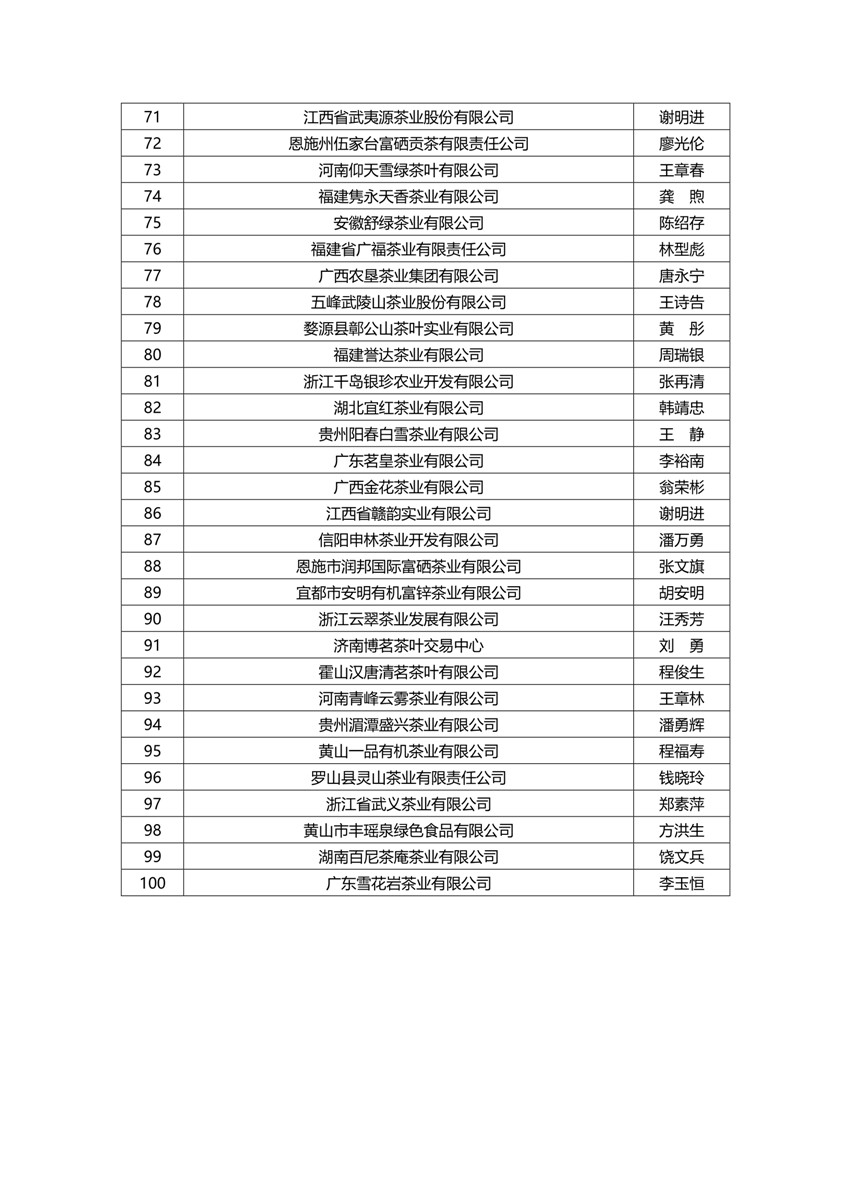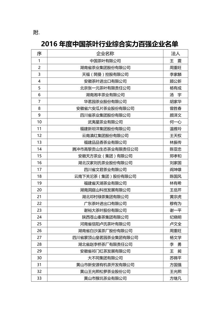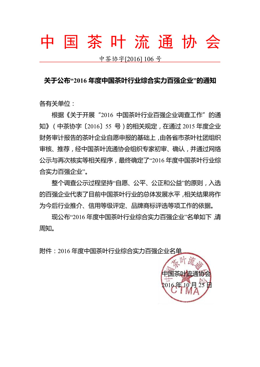 关于公布“2016年度中国茶叶行业综合实力百强企业”的通知