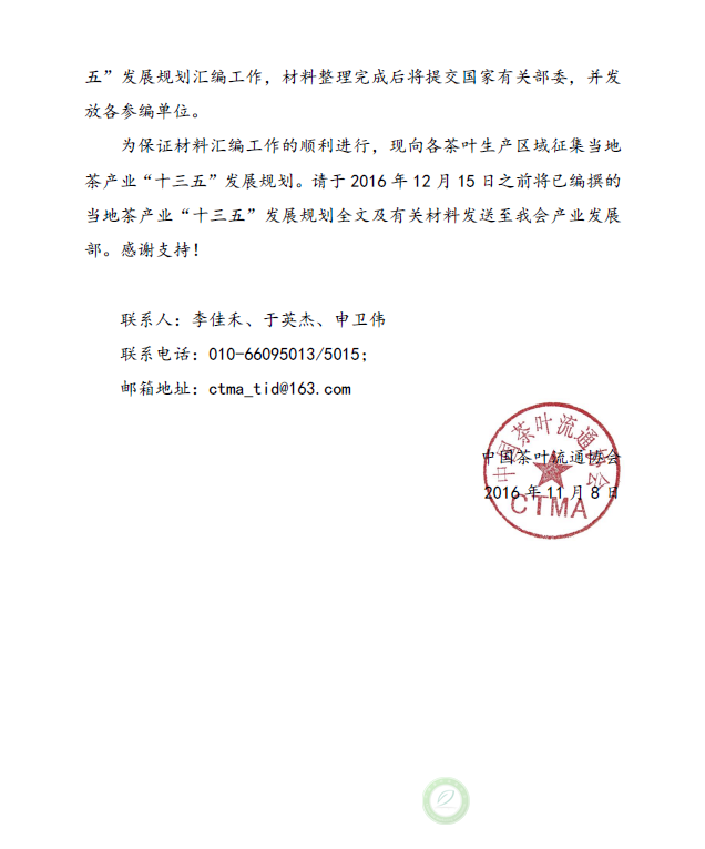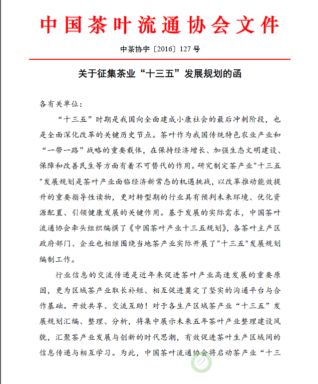 关于征集茶叶生产区域十三五规划汇编材料的通知