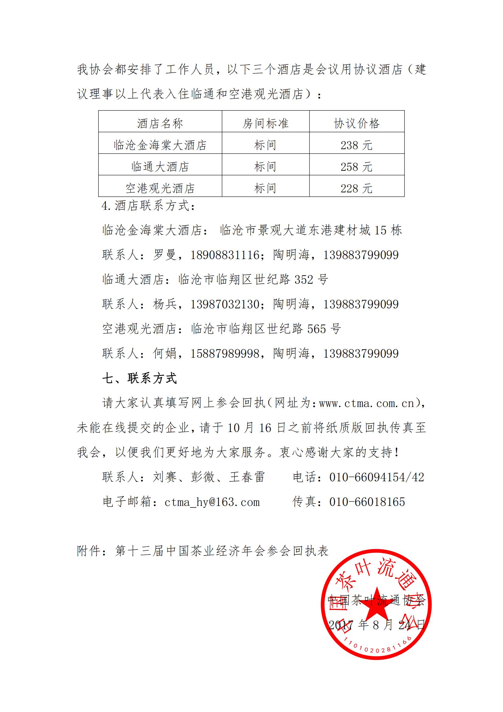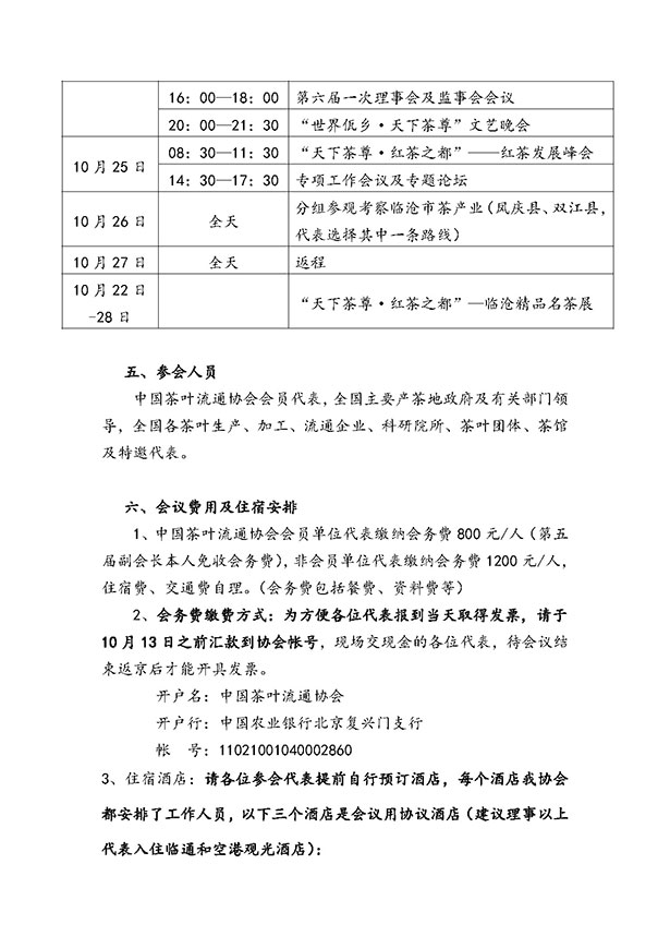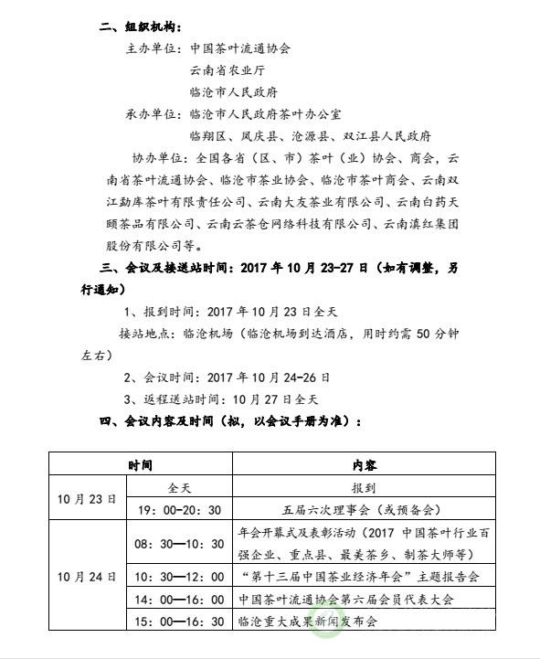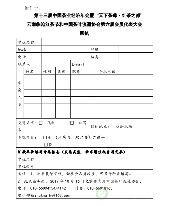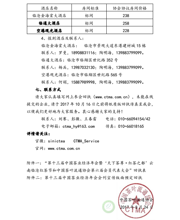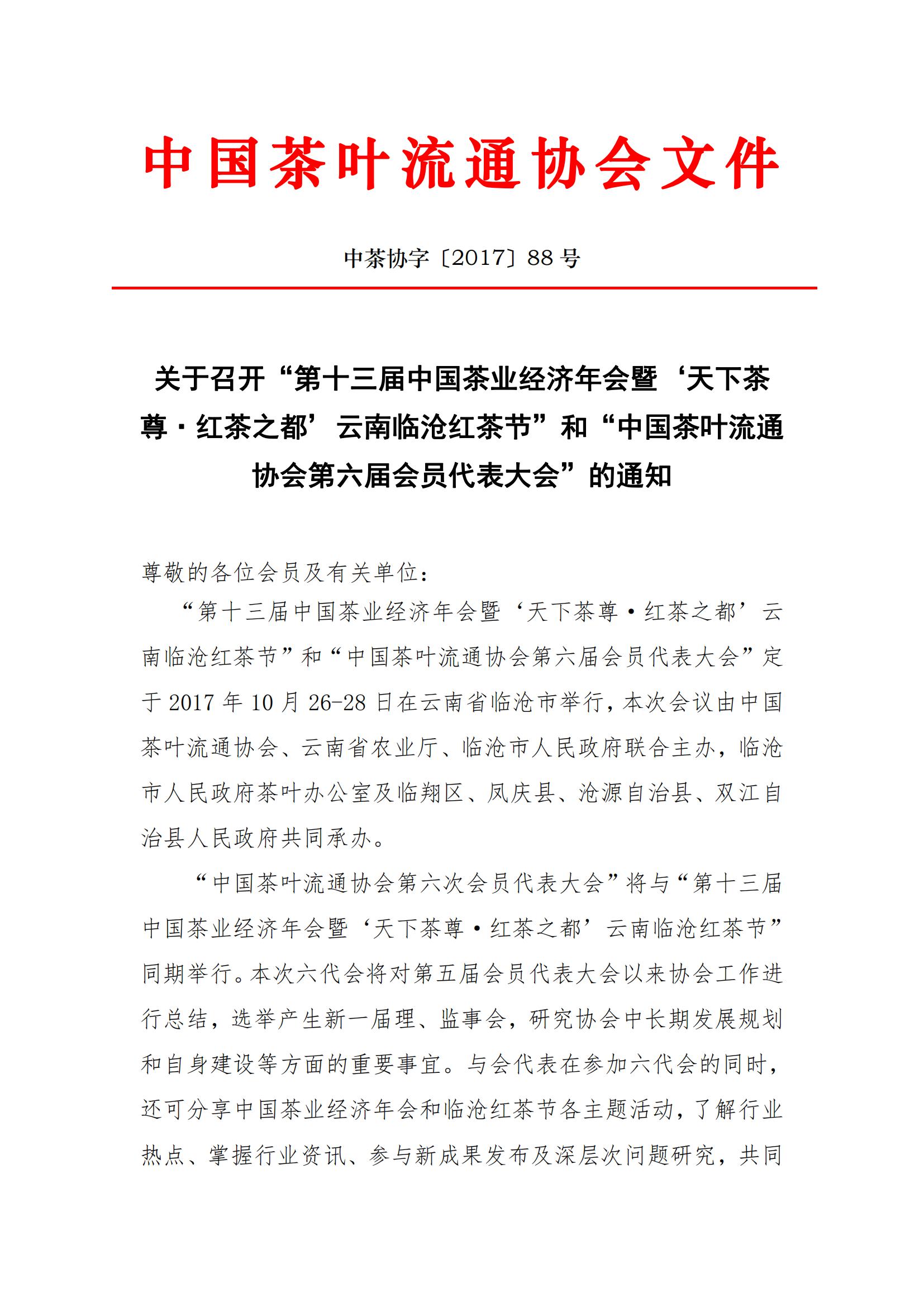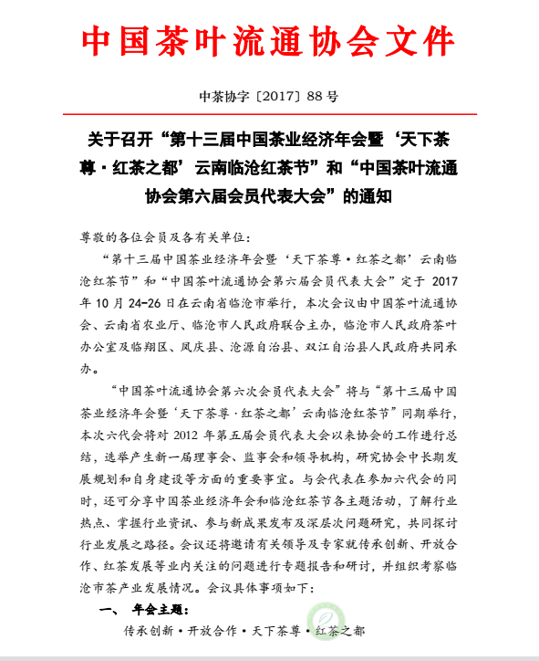 各会员单位: 因近期中央宣布,中国共产党第十九次全国代表大会将于10月18日在北京召开。为确保十九大顺利进行,“中国茶叶流通协会第六届会员代表大会”会期将调整为10月25日报到,26日开会。会议其他事项内容不变。 敬请各会员单位周知,详情请登录协会网站或致电中茶协会员部。 协会官网:www.ctma.com.cn 联系电话:0106-6094142/54