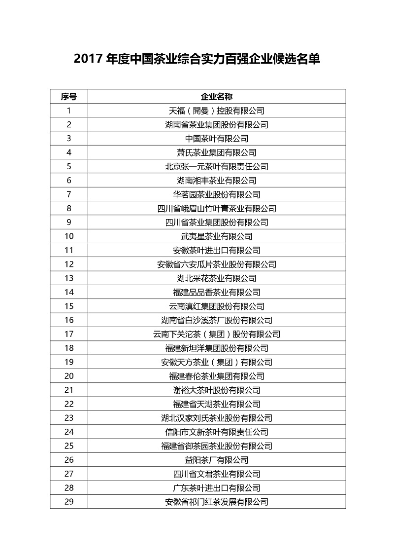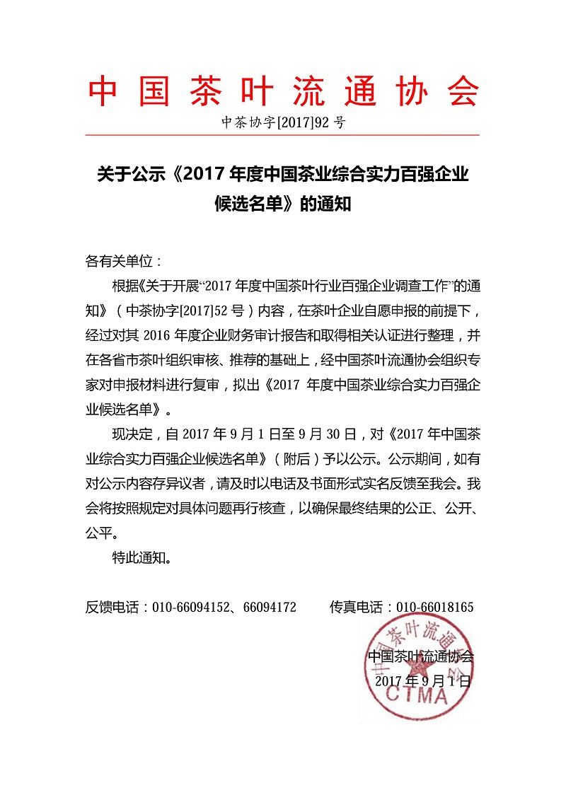 关于公示《2017年度中国茶业综合实力百强企业候选名单》的通知