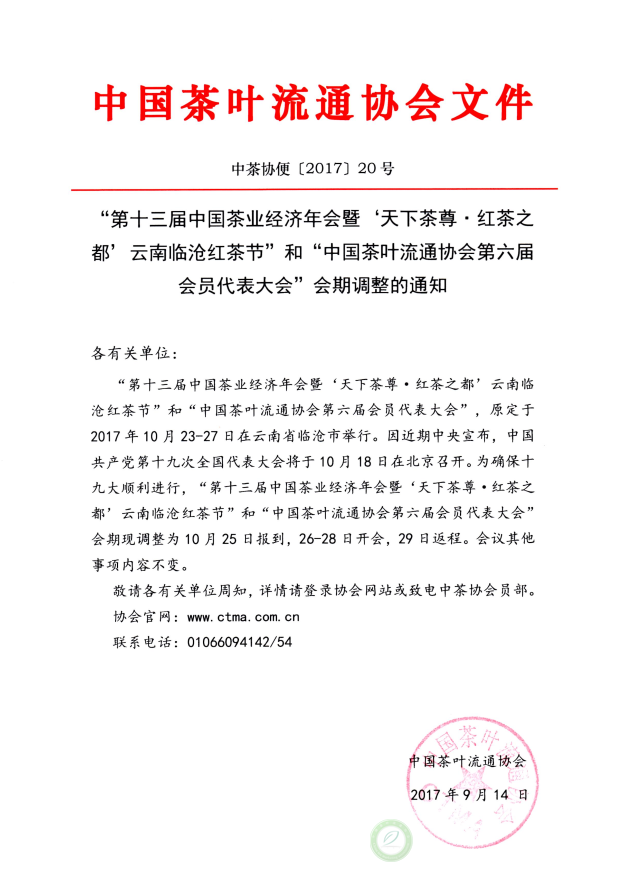 “第十三届茶业经济年会暨‘天下茶尊·红茶之都’云南临沧红茶节”和六代会会期调整的通知