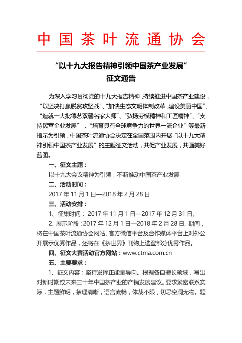 “以十九大报告精神引领中国茶产业发展”征文通告