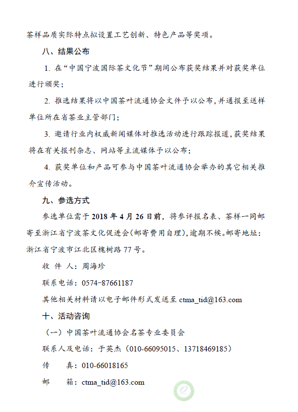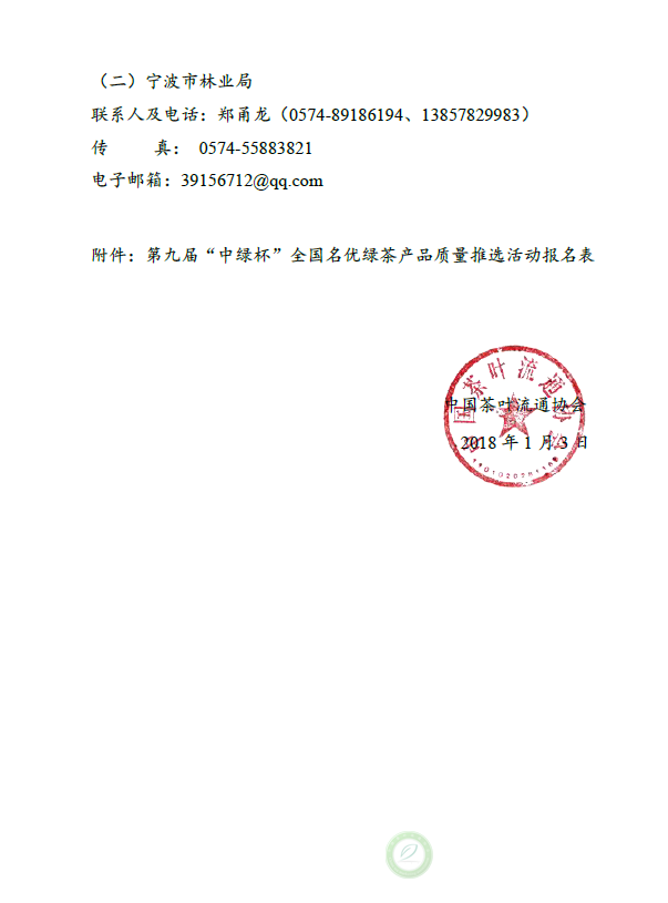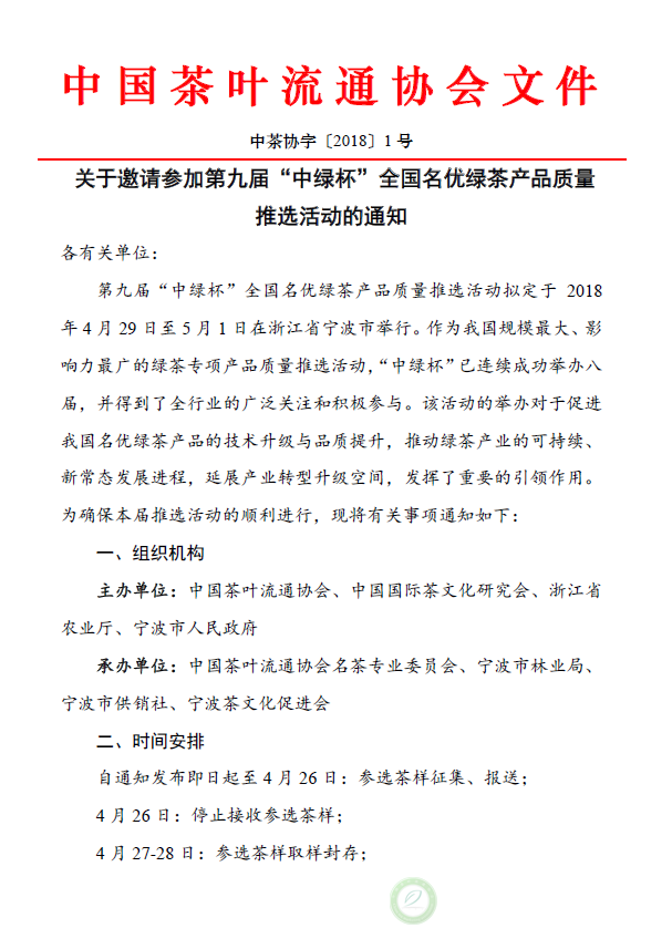 关于邀请参加第九届“中绿杯”全国名优绿茶产品质量推选活动的通知