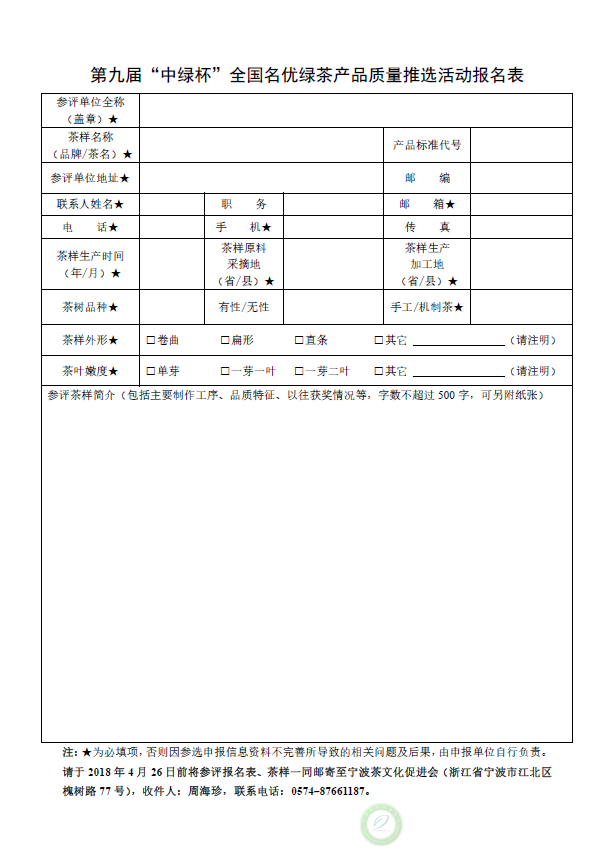 第九届“中绿杯”全国名优绿茶产品质量推选活动报名表