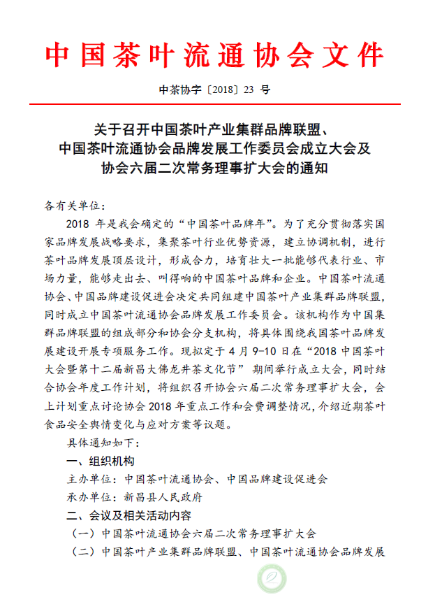 关于召开中国茶叶产业集群品牌联盟、中国茶叶流通协会品牌发展工作委员会成立大会及协会