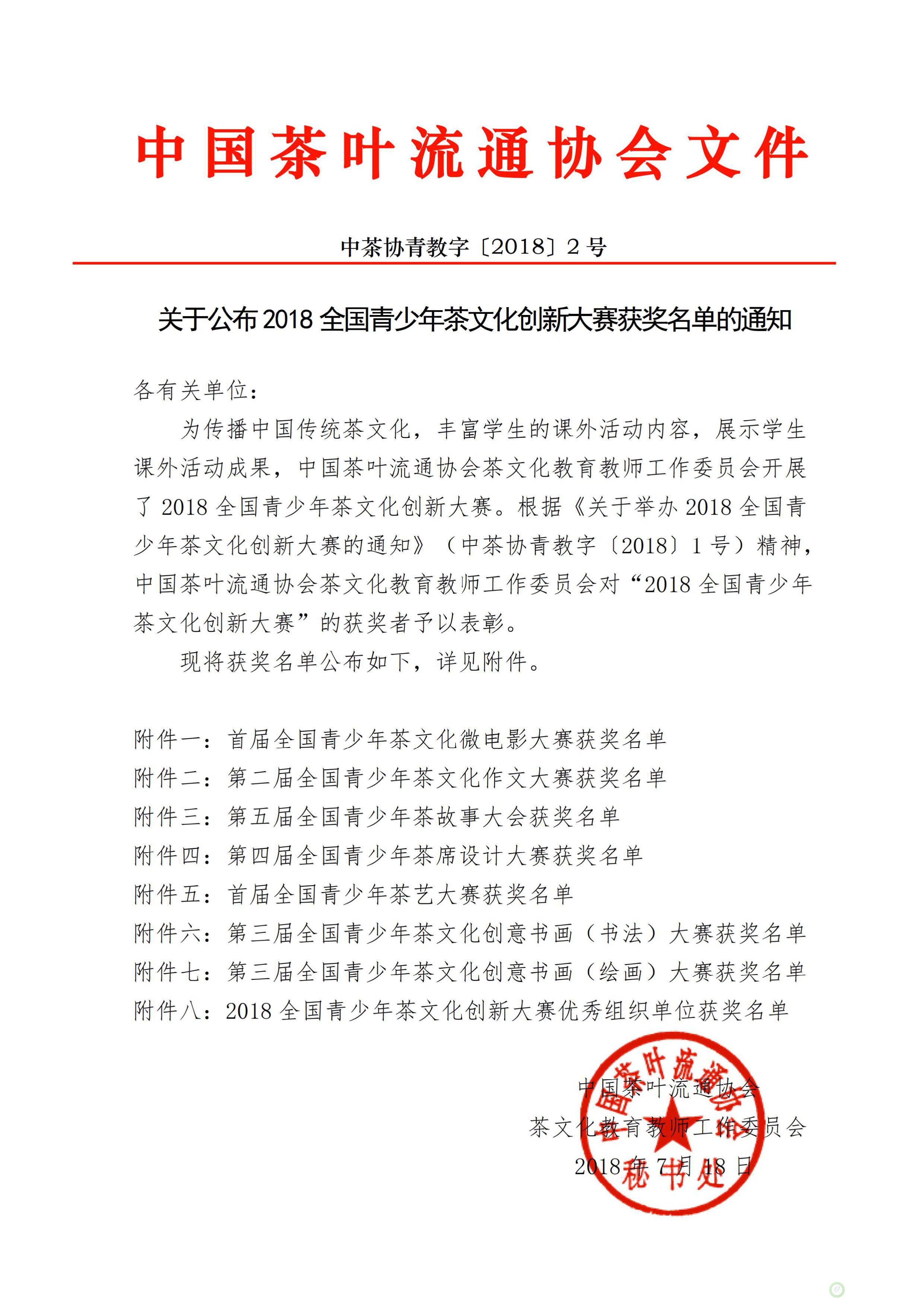 关于公布2018全国青少年茶文化创新大赛获奖名单的通知