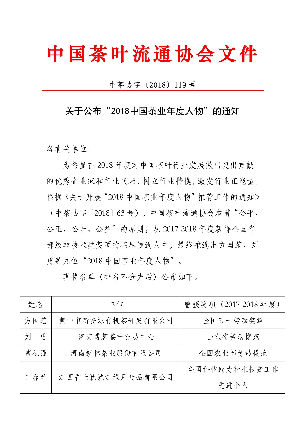 关于公布“2018中国茶业品牌传播力十强企业”的通知
