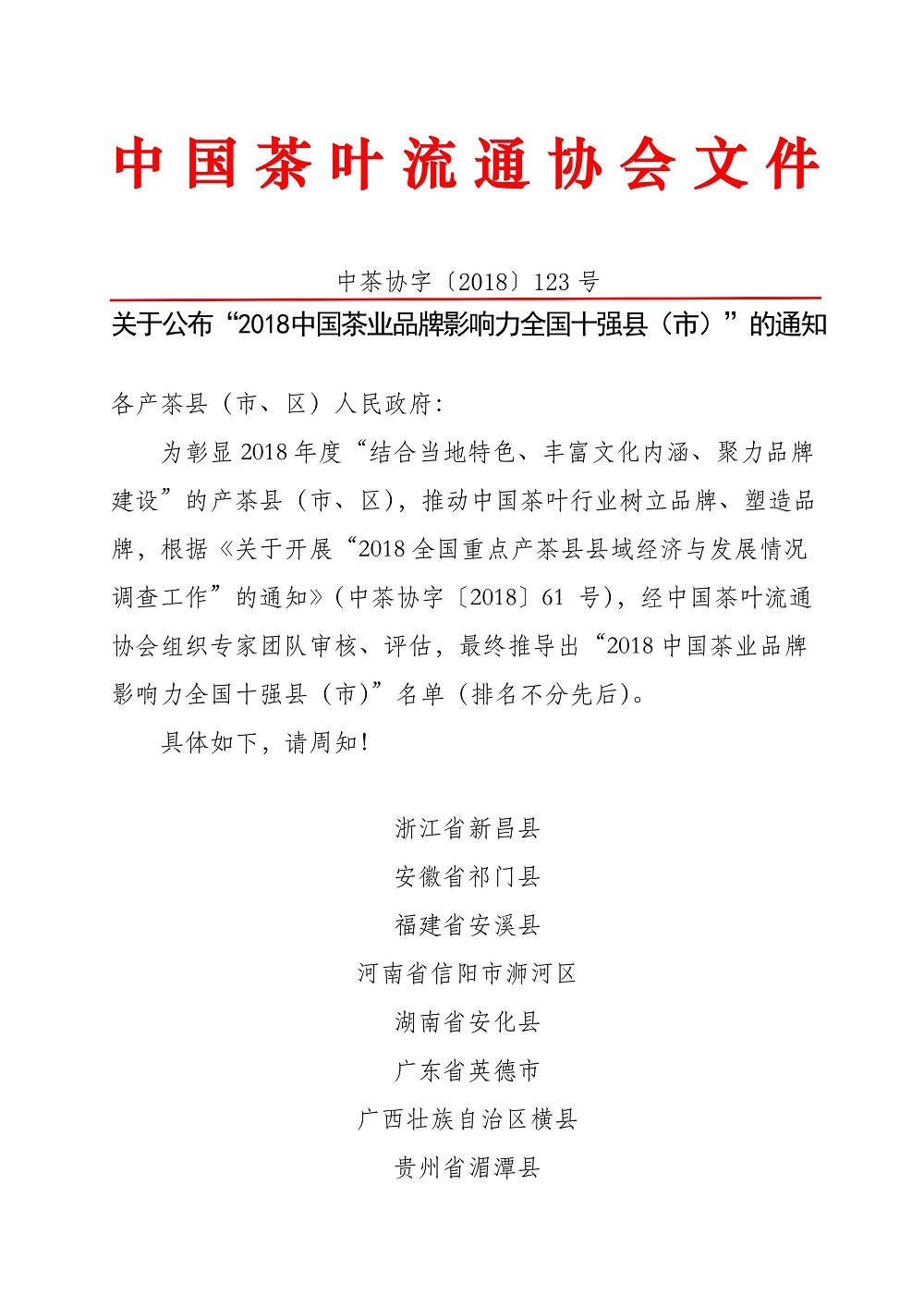 关于公布“2018中国茶业品牌影响力全国十强县(市)”的通知