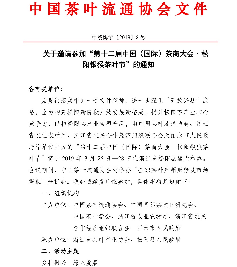 关于邀请参加“第十二届中国(国际)茶商大会·松阳银猴茶叶节”的通知