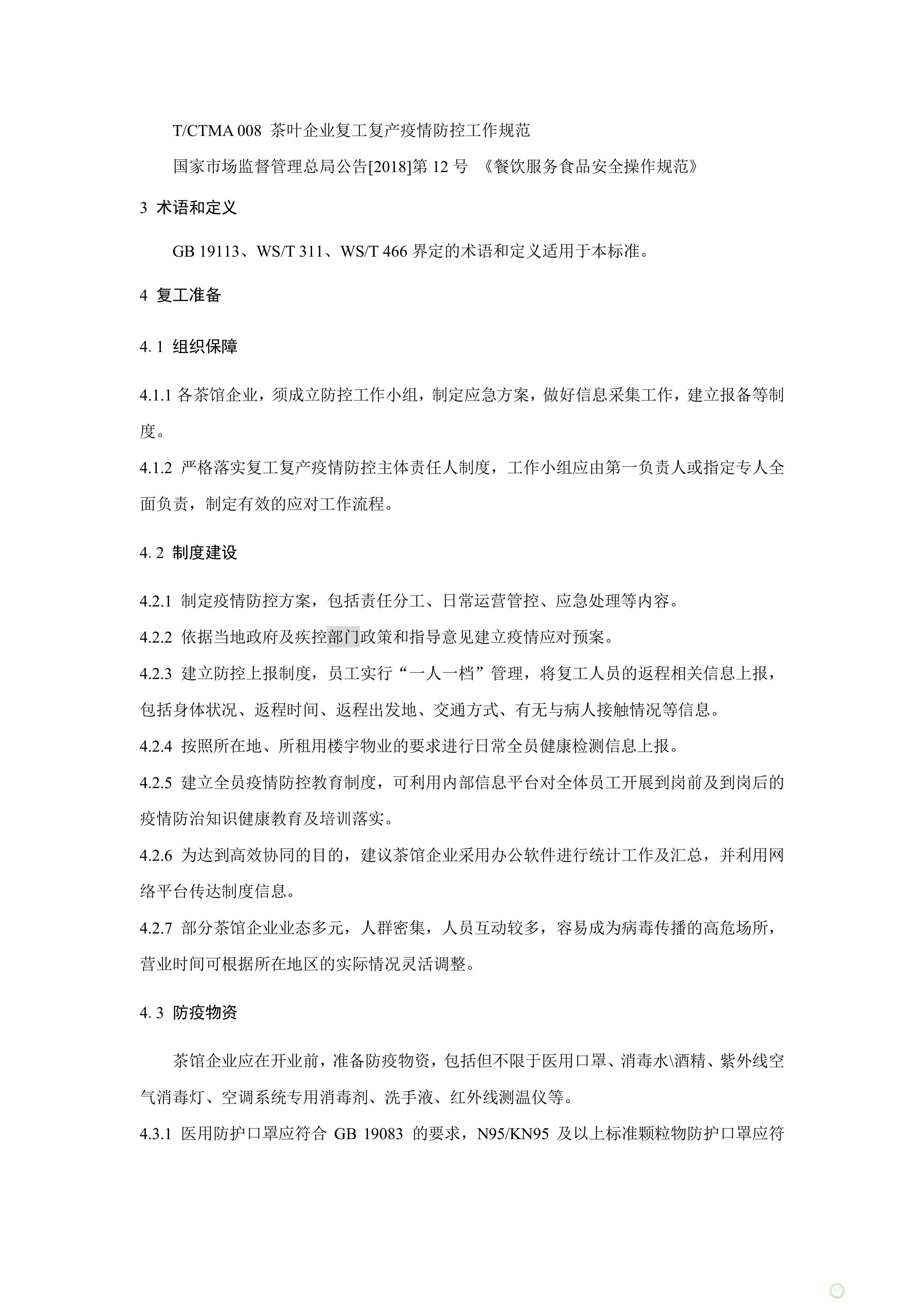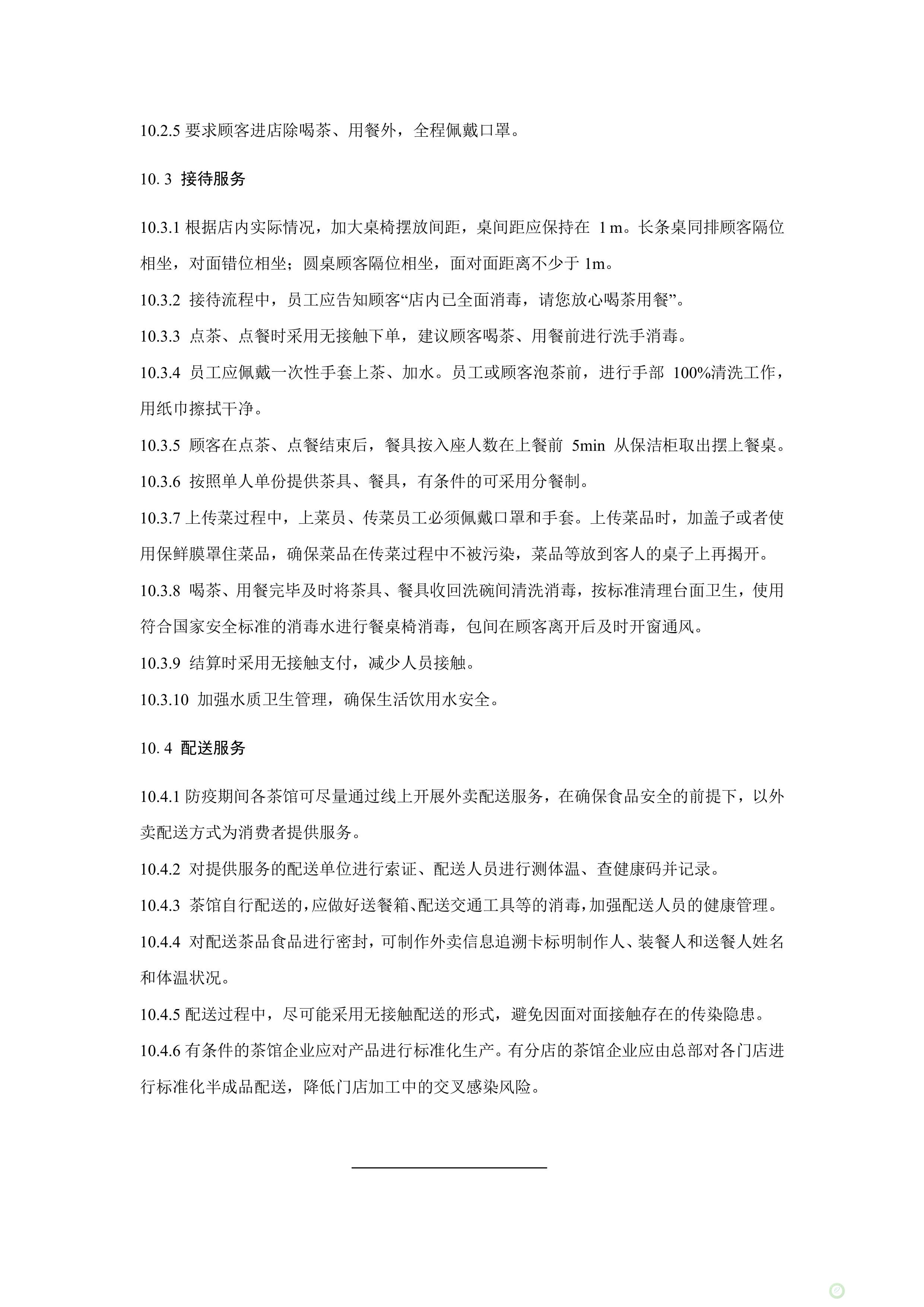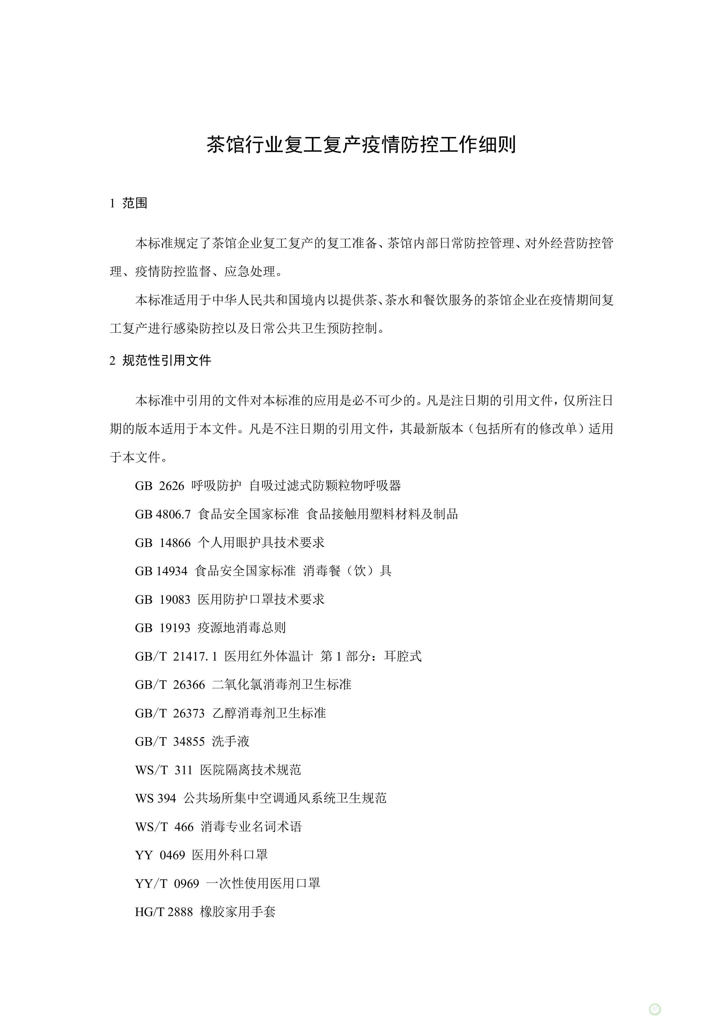为深入贯彻落实党中央、国务院关于切实加强疫情科学防控,有力有序推动企业复工复产、振兴消费的工作指示和要求,指导茶馆行业在疫情期间有序恢复经营,中国茶叶流通协会联合行业多家茶馆企业共同编制了团体标准《茶馆行业复工复产疫情防控工作细则》(T/CTMA 009-2020)。此项标准于2020年2月28日发布,自2020年2月29日起正式实施。