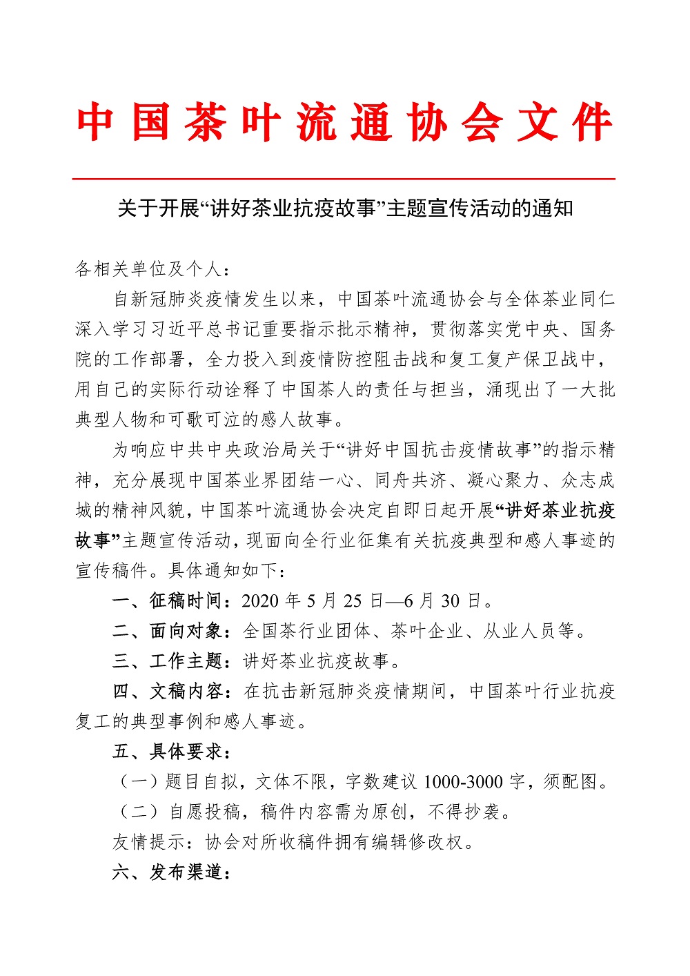 关于开展“讲好茶业抗疫故事”主题宣传活动的通知