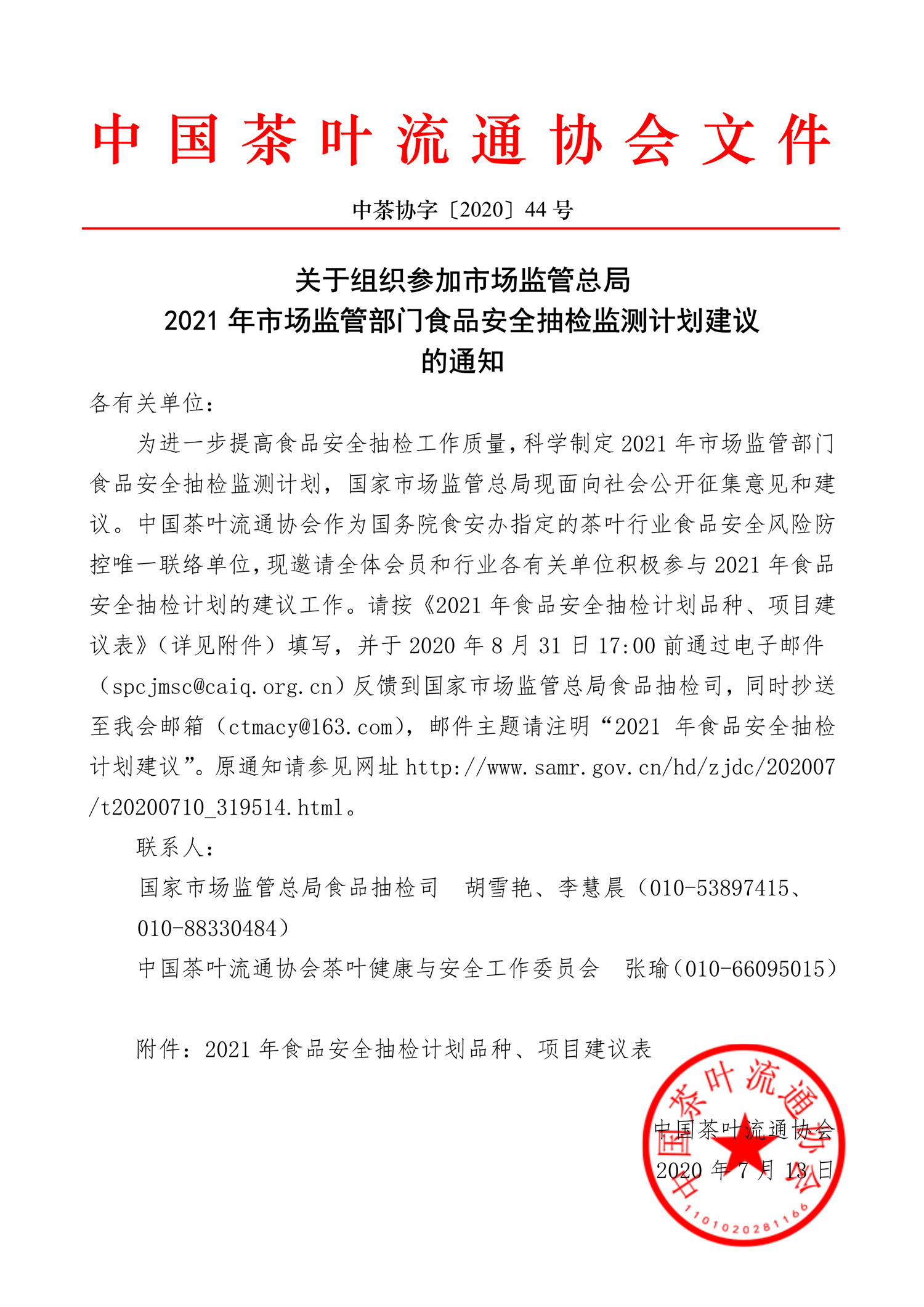 关于组织参加市场监管总局2021年市场监管部门食品安全抽检监测计划建议的通知