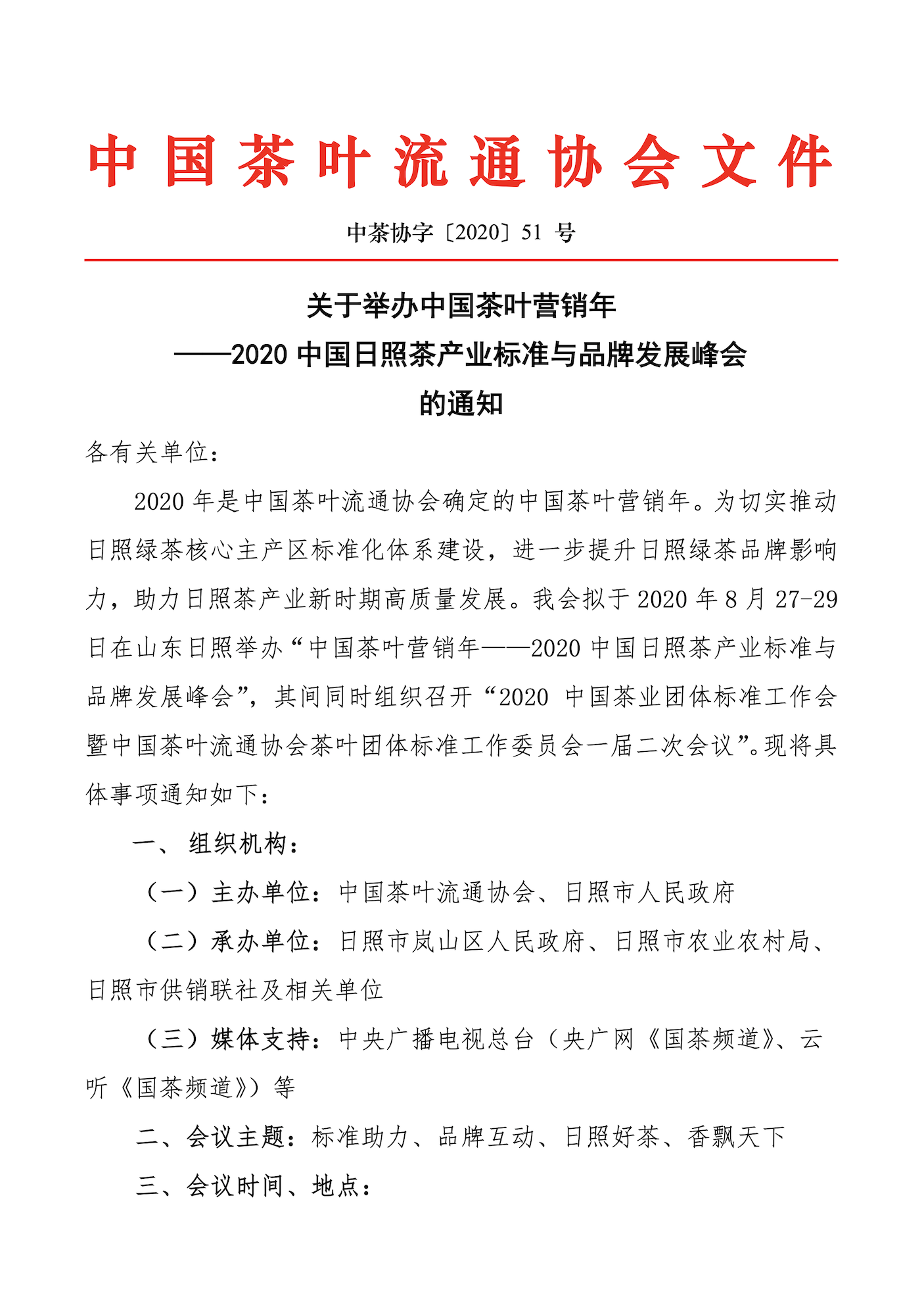 关于举办中国茶叶营销年——2020中国日照茶产业标准与品牌发展峰会的通知