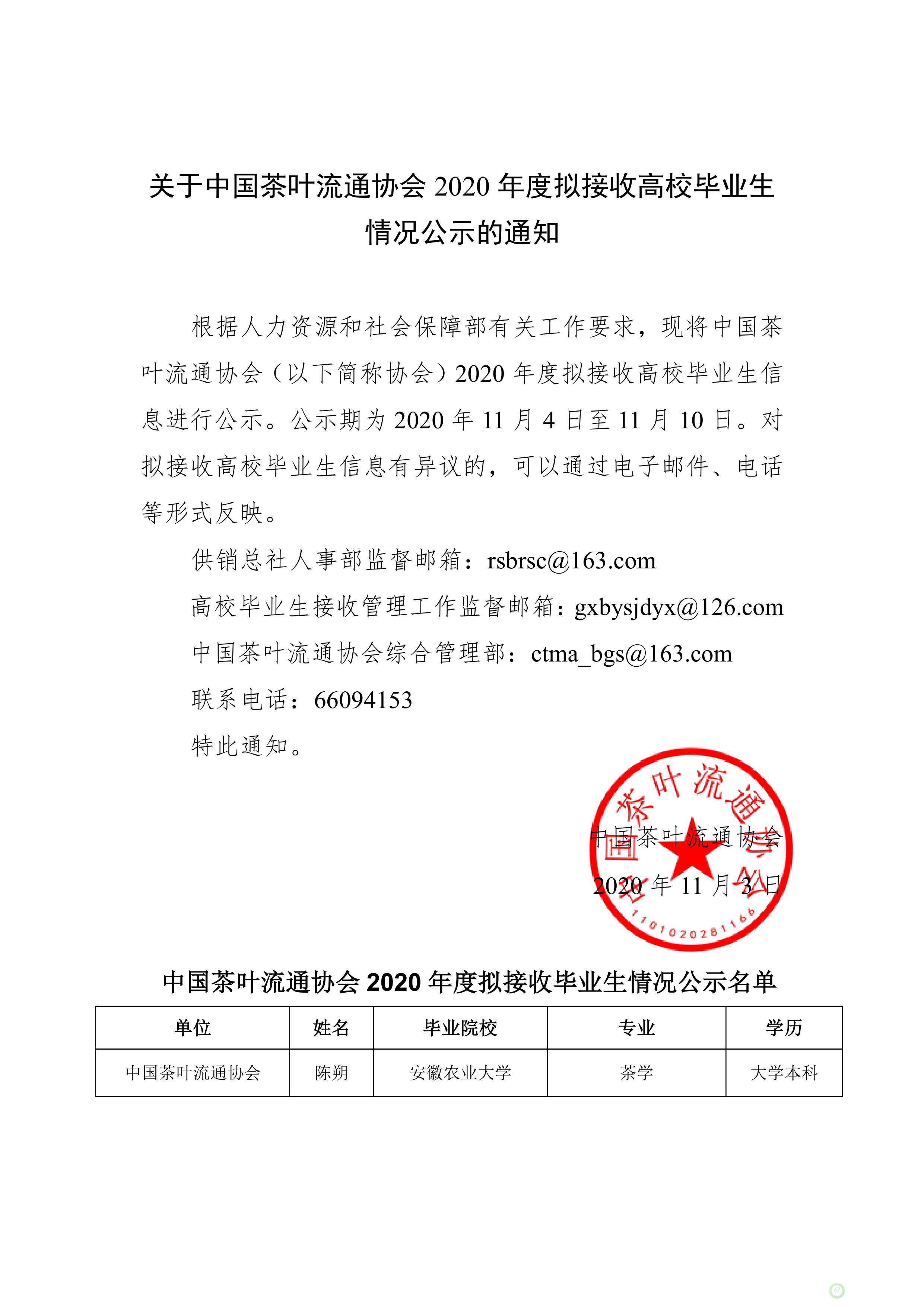 关于中国茶叶流通协会2020年度拟接收高校毕业生情况公示的通知