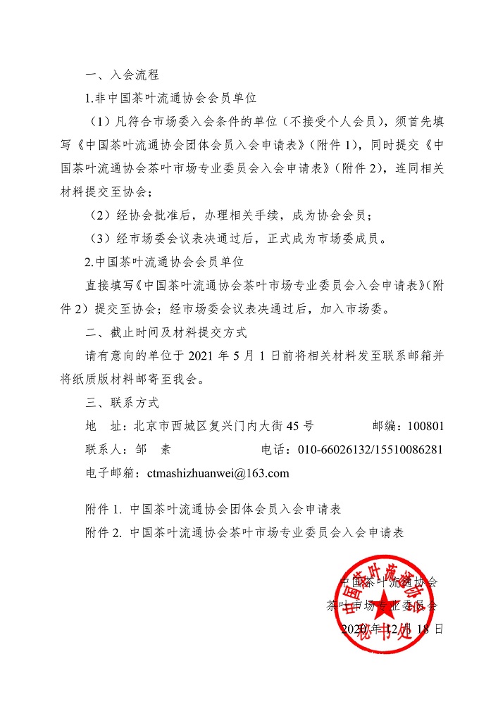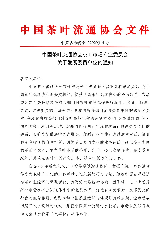 中国茶叶流通协会茶叶市场专业委员会关于发展委员单位的通知