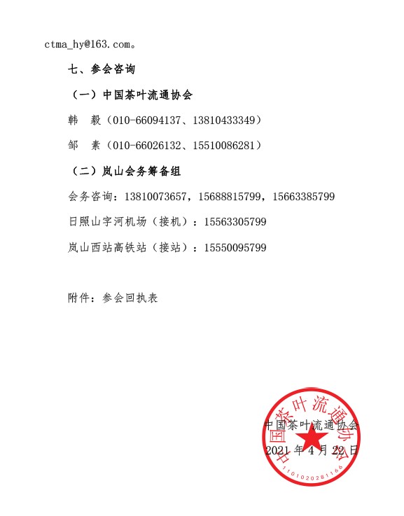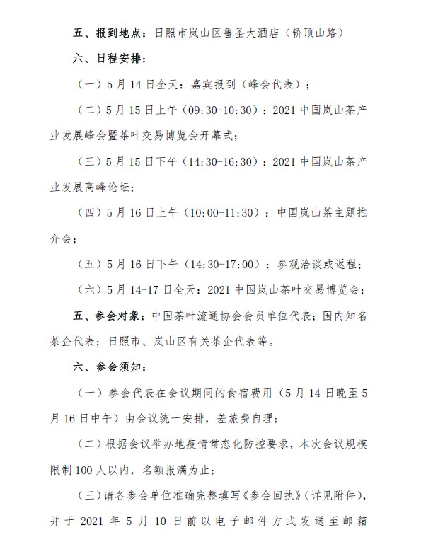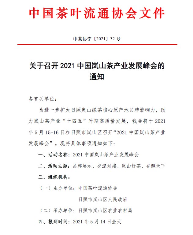 关于邀请参加“2021中国岚山茶产业发展峰会暨茶叶交易博览会”的通知