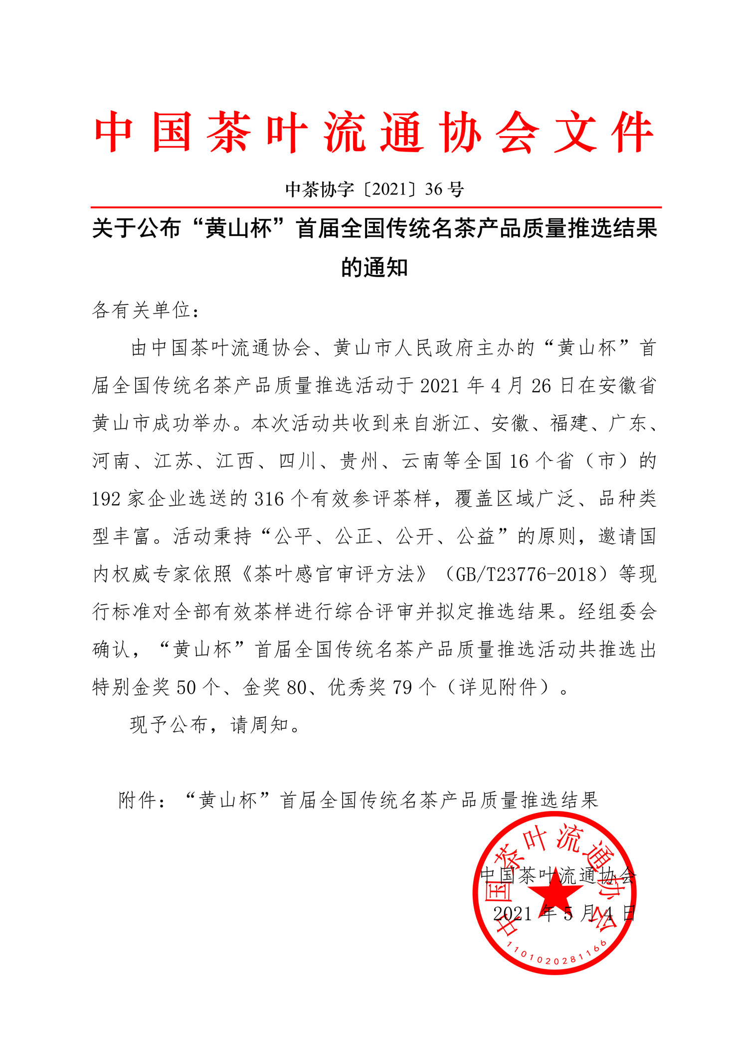 中茶协字〔2021〕36号——关于公布“黄山杯”首届全国传统名茶产品质量推选结果的通知.pdf