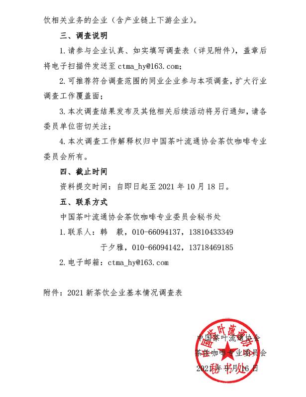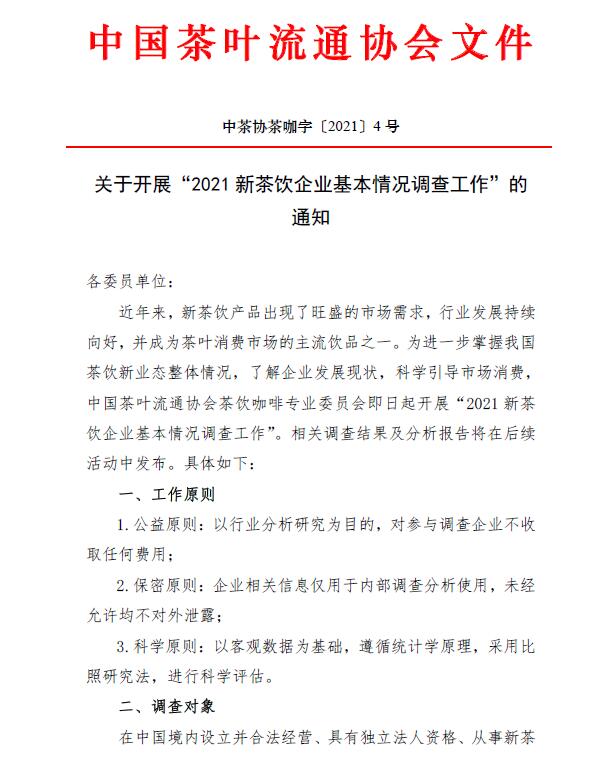 关于开展“2021新茶饮企业基本情况调查工作”的通知