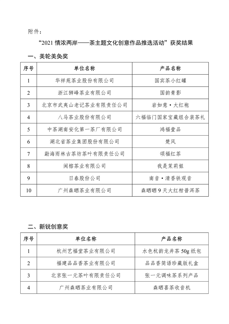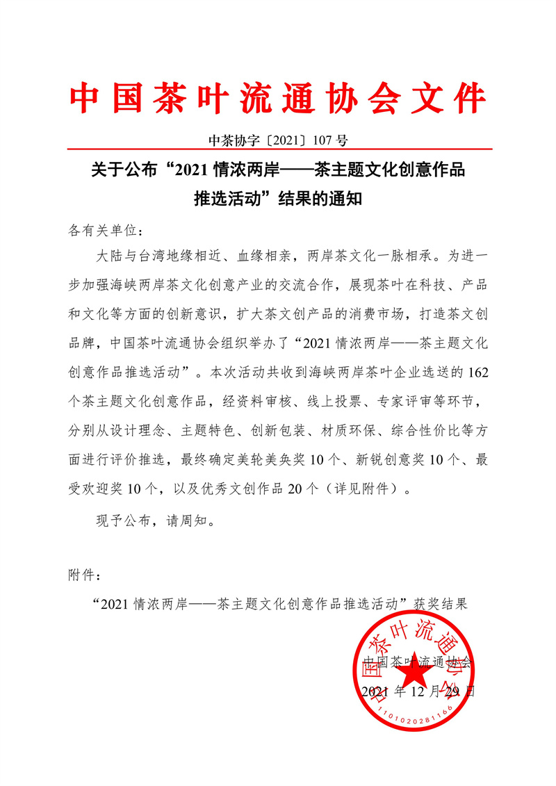 关于公布“2021情浓两岸——茶主题文化创意作品推选活动”结果的通知