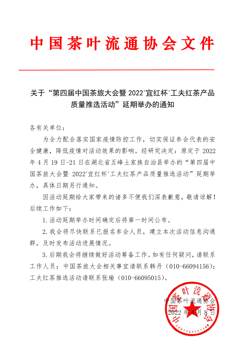 关于“第四届中国茶旅大会暨2022´宜红杯´工夫红茶产品质量推选活动”延期举办的通知
